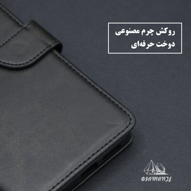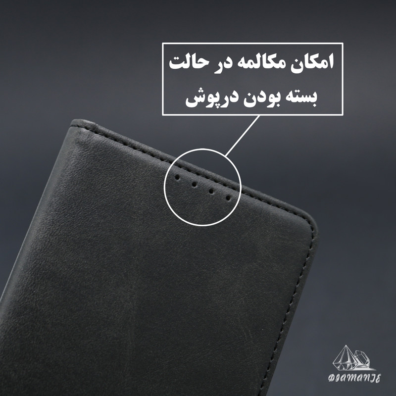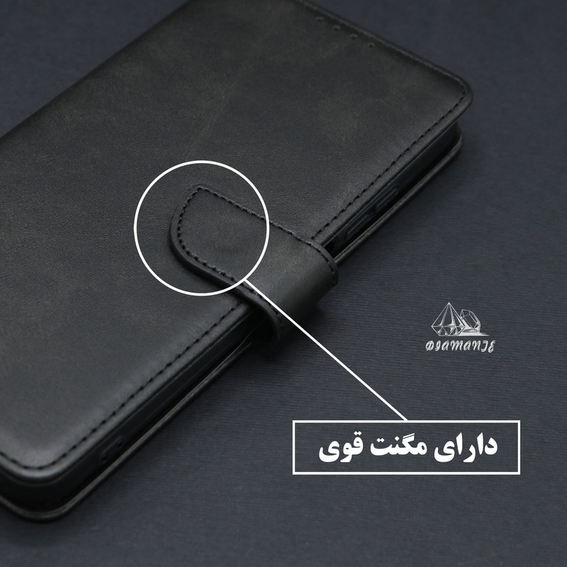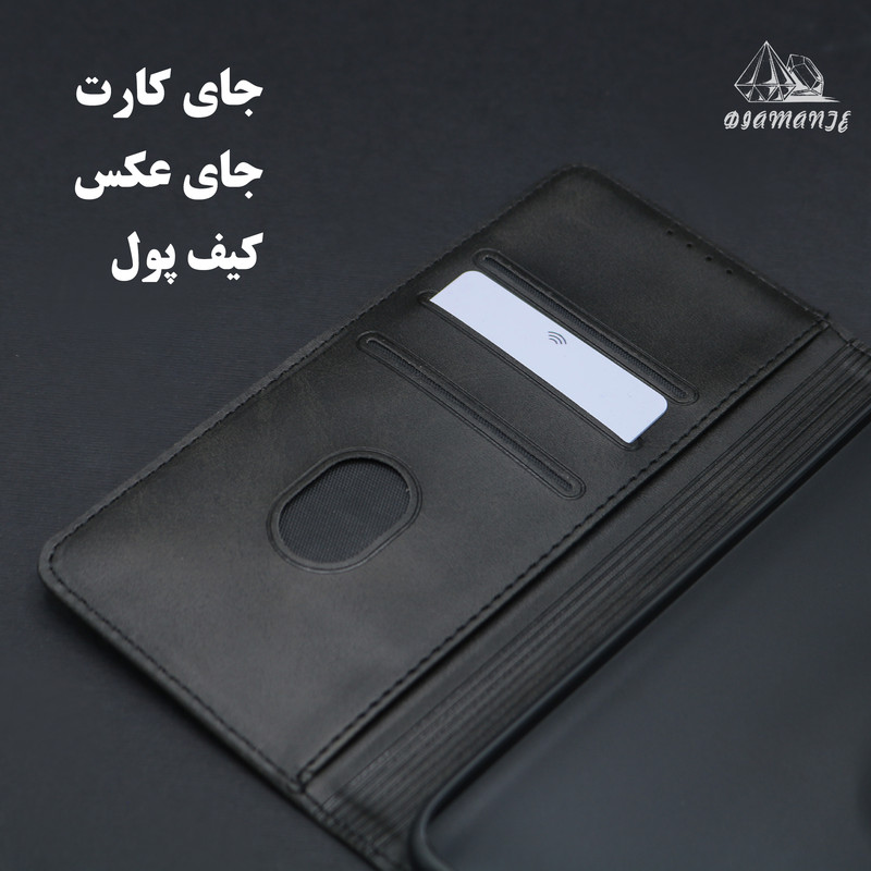 سایر توضیحات : قابلیت استفاده به صورت استند دارای جای کارت و وجه نقد چرم مصنوعی با کیفیت کاربردی و مقاوم کیفیت دوخت بالا دارای قفل آهنربایی