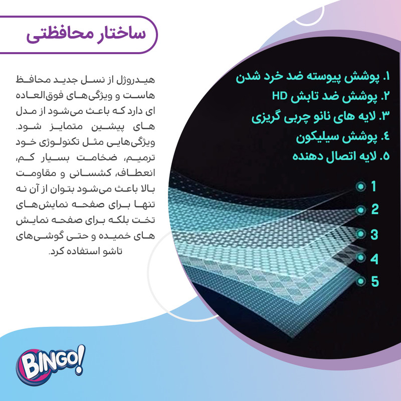 ویژگی‌ها : جلوگیری از انعکاس نور , قابلیت نصب آسان , مقاوم در برابر خط و خش , مقاوم در برابر چربی و اثرانگشت