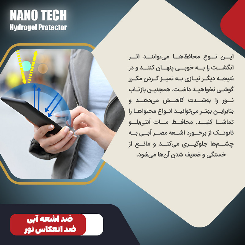 ویژگی‌ها : جلوگیری از انعکاس نور , قابلیت نصب آسان , مقاوم در برابر چربی و اثرانگشت , مقاوم در برابر خط و خش