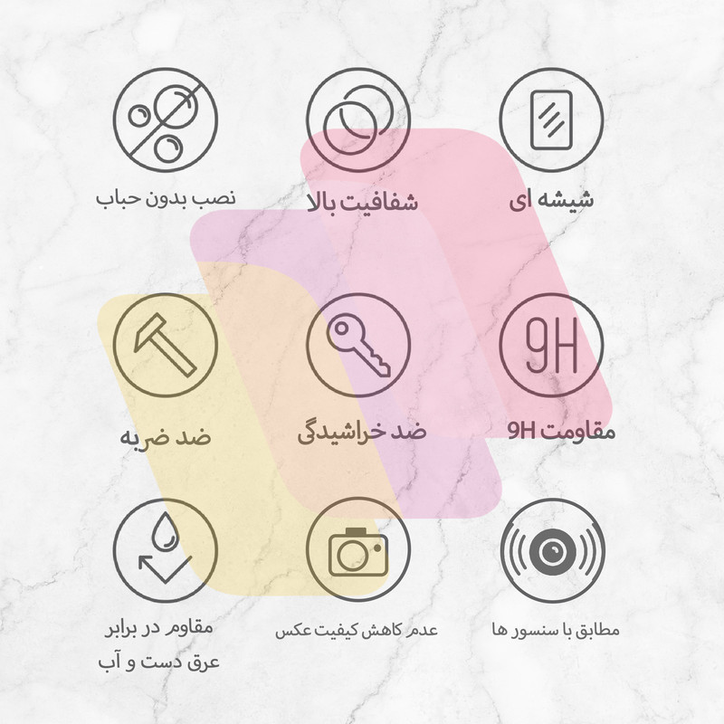 ویژگی‌ها : نصب بدون حباب , مقاوم در برابر خط و خش , قابلیت نصب آسان , جلوگیری از ایجاد خط و خش , 9H