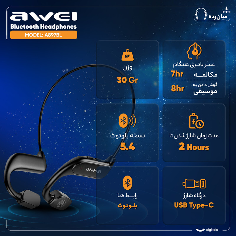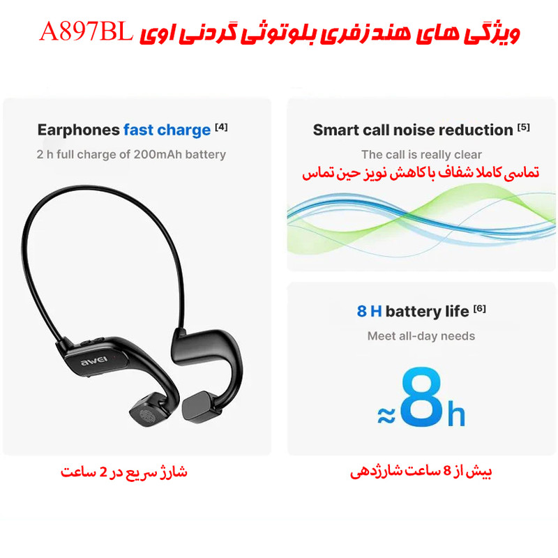 هدفون بلوتوثی اوی مدل A897BL با طراحی گردنی (Neckband) تجربهای متفاوت از استفاده راحت و بلندمدت ارائه میدهد. بدنه این هدفون از پلاستیک ABS ساخته شده و با وزن سبک ۳۰ گرم، حمل و استفاده در طول روز آسان است. طراحی گردنی باعث میشود هدفون هنگام فعالیتهای ورزشی یا حرکت مداوم پایدار روی گردن قرار گیرد و از افتادن یا جا ماندن جلوگیری شود. اتصال بیسیم از طریق بلوتوث نسخه ۵.۴ برقرار شده و محدوده عملکرد تا ۱۰ متر، آزادی عمل کافی برای جابهجایی را فراهم میکند. این مدل از پروتکلهای بلوتوث A2DP, HSP, HFP, AVRCP پشتیبانی کرده و تاخیر صدای کمتر از ۰.۰۳۸ ثانیه تجربهای روان در پخش موسیقی و مکالمه ایجاد میکند.