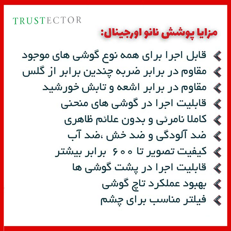 ویژگیها: 9H , جلوگیری از ایجاد خط و خش , قابلیت نصب آسان , مقاوم در برابر چربی و اثرانگشت , مقاوم در برابر خط و خش , نصب بدون حباب