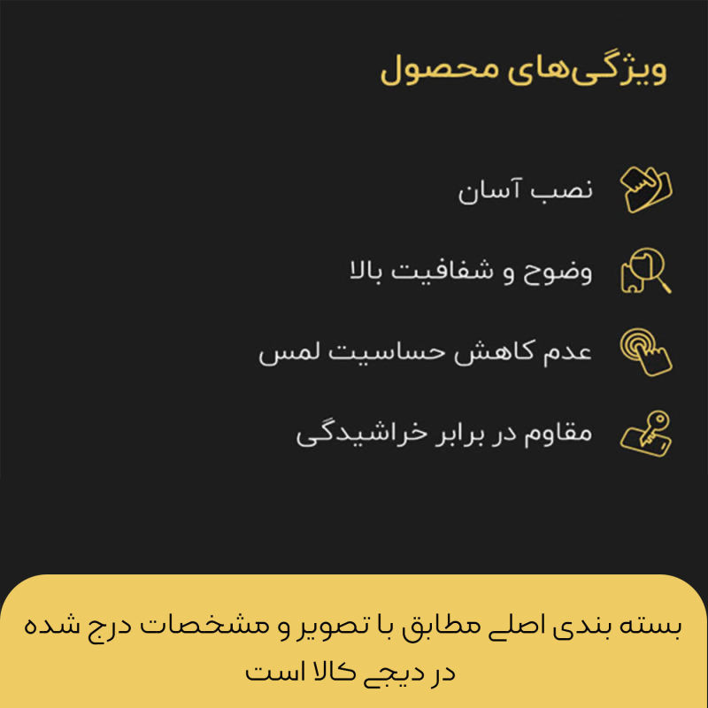 ویژگیها: 9H , جلوگیری از انعکاس نور , جلوگیری از ایجاد خط و خش , قابلیت نصب آسان , مقاوم در برابر چربی و اثرانگشت , مقاوم در برابر خط و خش , نصب بدون حباب