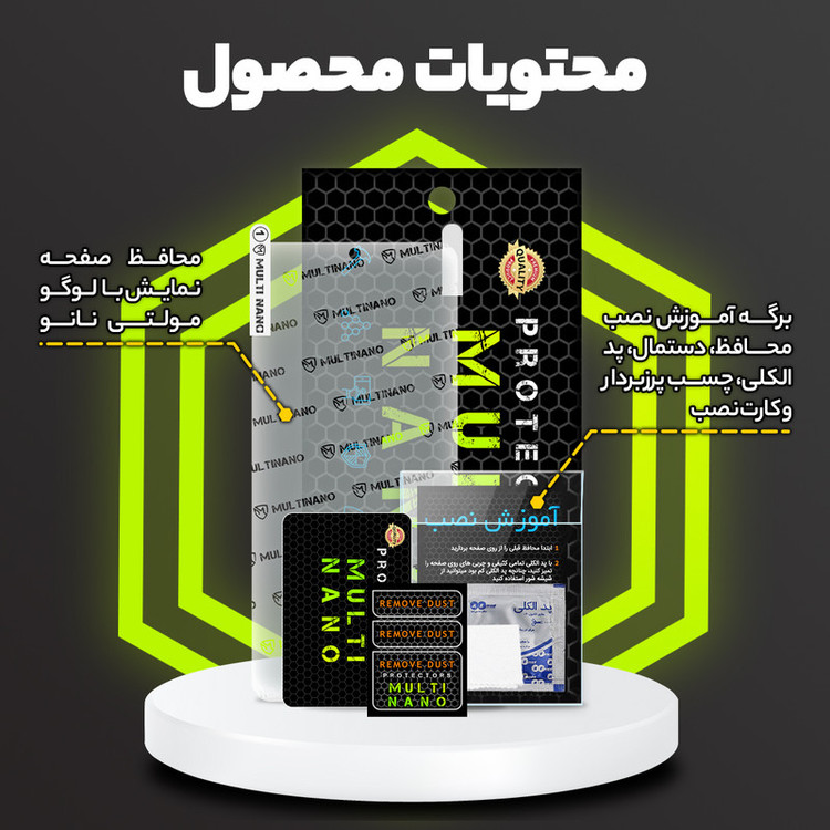شامل یک عدد محافظ صفحه نمایش مات - پد الکلی - برچسب پرز بردار - دستمال مناسب برای تمیز کردن گوشی - کارت نصب - آموزش نصب