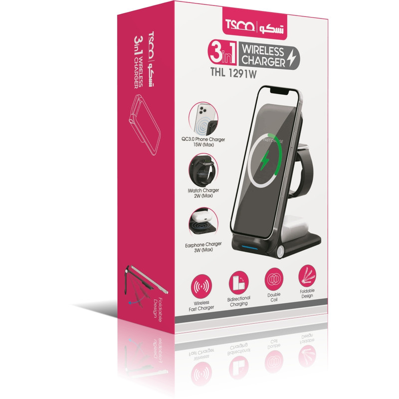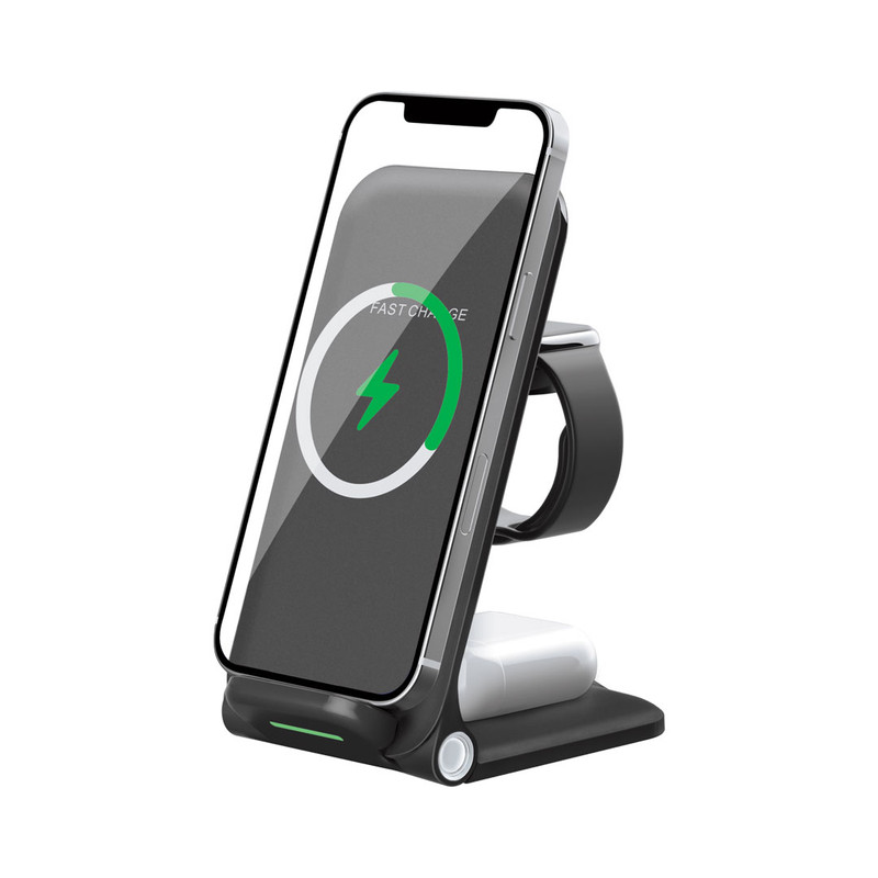 سایر توضیحات: فابلیت شارژ 3 دستگاه تلفن همراه و ساعت هوشمند و ایربادز به طور همزمان , قابلیت جمع شوندگی , ولتاژ خروجی برای تلفن همراه : 5W , 7.5W , 10W , 15W , ساعت هوشمند : 2W , ایربادز : 3W