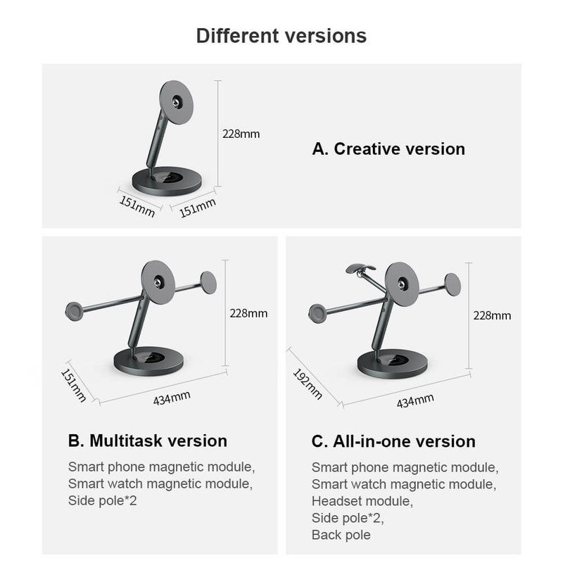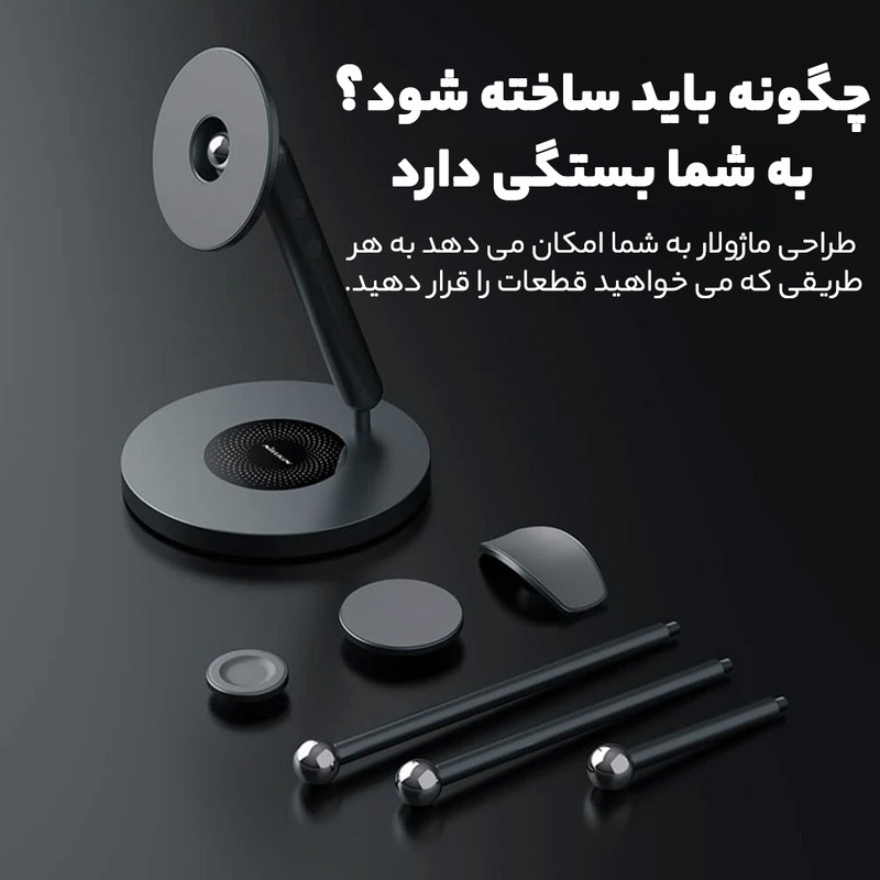 قابل تنظیم در 3 حالت مختلف جهت استفاده در محیط های مختلف مغناطیس فوق العاده قوی تا تحمل وزن بالغ بر 2 کیلوگرم امکان جرخش 360 درجه در قسمت پایه و 90 درجه برای تبلت و گوشی همراه