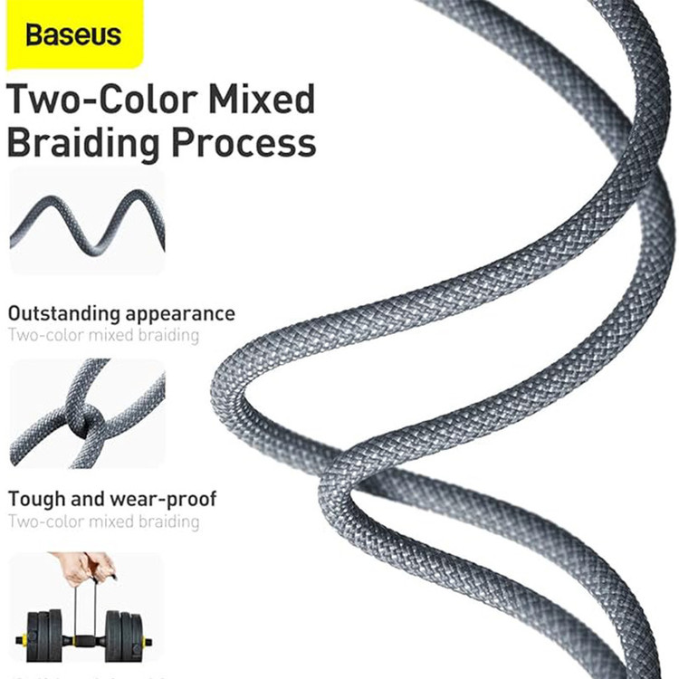 این کابل از قابلیت PD بهرهمند است، به این جهت، امکان شارژ بازه گستردهتری از وسایل برای شما وجود خواهد داشت. گفتنی است که سیمهای درون کابل نسبتا ضخیمتر شدهاند و همین امر برای بهتر عمل کردن کابل بوده است. کابل دارای روکشی از کنف است که بر مقاومت آن افزوده، این روکش مانع از پاره شدن و کشیدگی کابل میشود و استحگام آن را افزایش میدهد. این پوشش حالتی دو رنگ را برای کابل ایجاد کرده که فرمی سایهروشن ایجاد کرده، به این ترتیب زیبایی کابل بیشتر شده است. ماده دیگری هم که در ساخت کابل مورد استفاده قرار گرفته است، ABS است. طول کابل برابر با 2 متر است و برای استفادههای روزمره بسیار مناسب است. همچنین این کابل دارای استانداردهای CE ، FCC و RoHS نیز هست، پس برای استفاده از آن خاطر جمع باشید.
