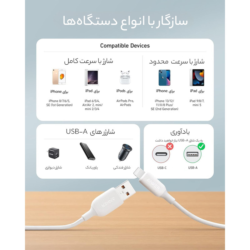 سازگار با: انواع گوشیهای موبایل و تبلتهای مجهز به درگاه لایتنینگ (اپل)