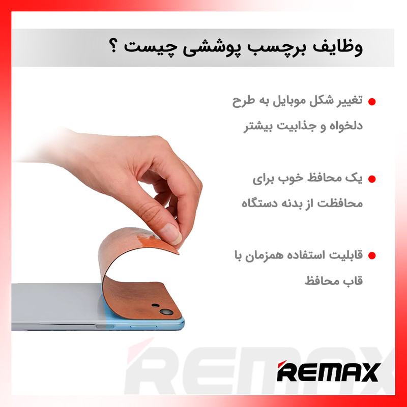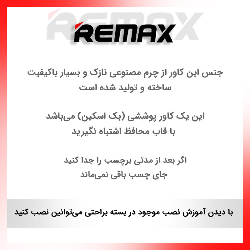 محافظت از بدنه اصلی گوشی در برابر خط و خش و تا حدودی ضربه – نصب آسان – برند معتبر ریمکس – امکان استفاده همزمان با قاب یا کاور محافظ – بجا نماندن آثار چسب پس از جداسازی – تغییر چشمگیر و خاص شدن موبایل پس از نصب.