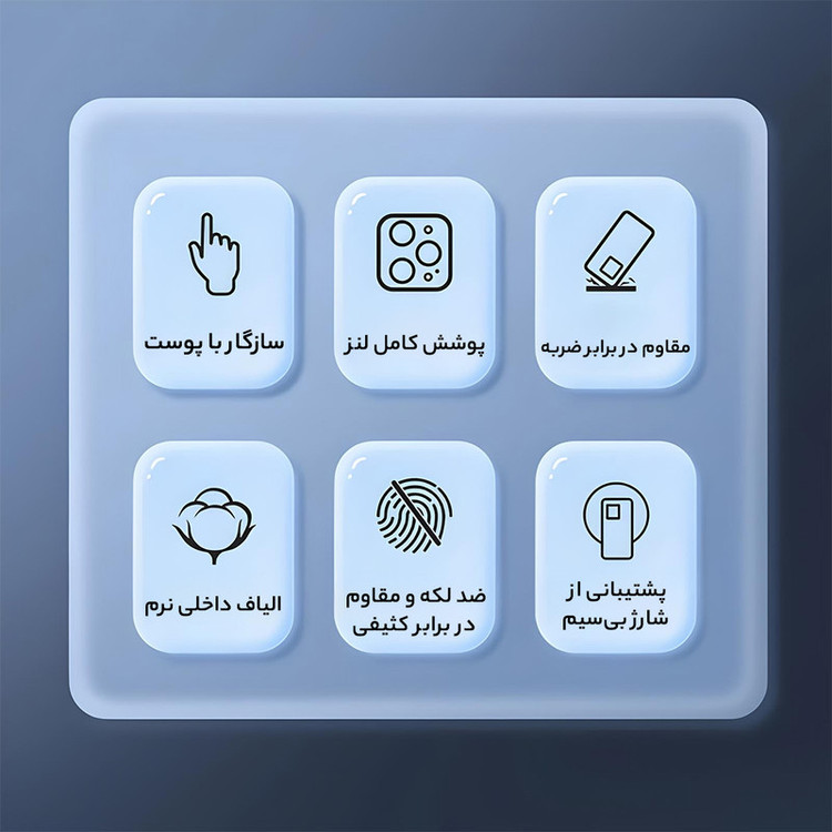 مقاوم در برابر ضربه , مقاوم در برابر آب , دارای استانداردهای نظامی مقاومت در برابر سقوط , انعطاف پذیر , دارای پوشش نرم داخلی , لبه های برجسته برای محافظت صفحه نمایش , لبه های برجسته برای محافظت دوربین , مقاوم در برابر خط و خش