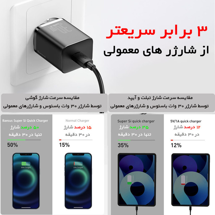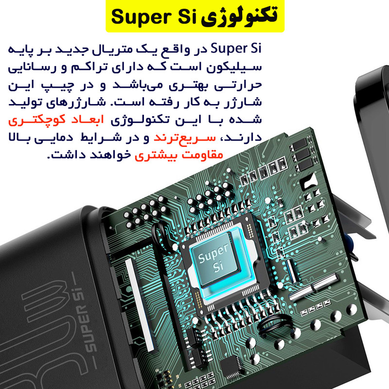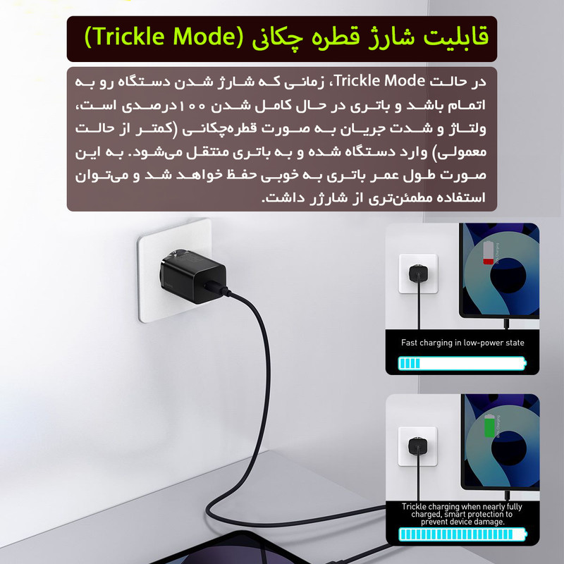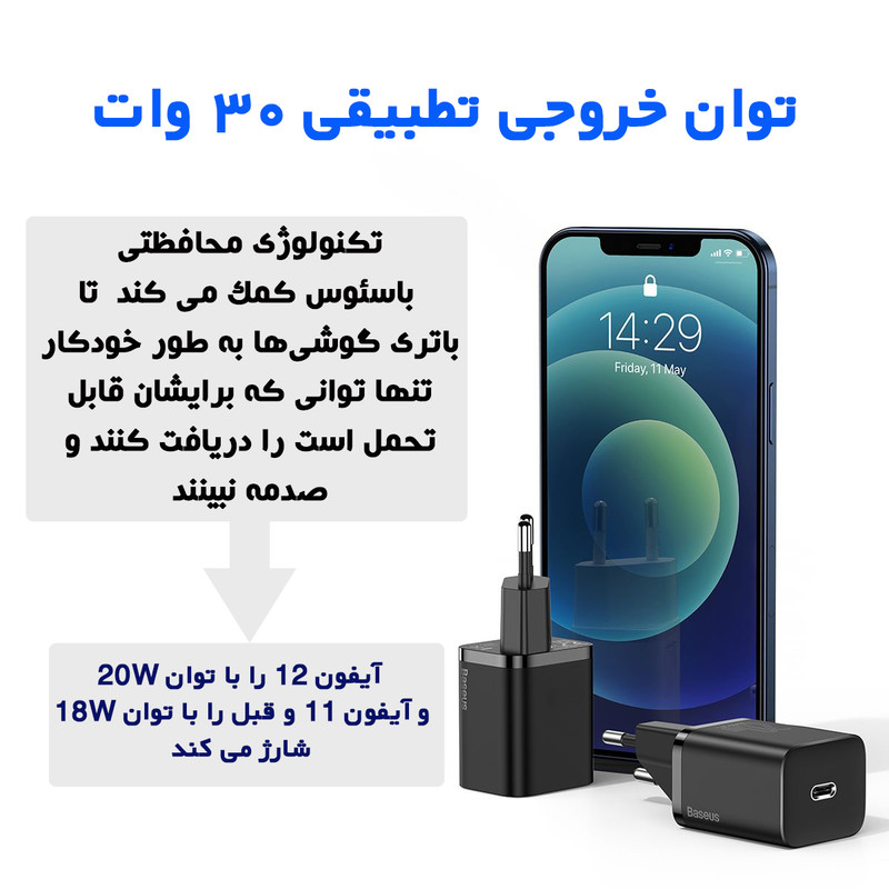 آداپتور فست شارژ بیسوس Baseus Super Si Quick Charger محصولی دیگر از کمپانی باسئوس بوده و دارای یک پورت Type C است که از پروتکل PD پشتیبانی میکند.تمام گوشیهای اپل که بعد از مدل Apple iPhone 8 عرضه شدهاند از قابلیت شارژ PD پشتیبانی میکنند. این قابلیت دارای قدرت شارژی 3 برابر سریعتر از شارژهای 5V/1A است و قادر خواهد بود در مدت زمان بسیار کوتاهتری گوشی شما را شارژ نماید. بهطور کلی باید به میزان ولتاژ و شدت جریان خروجی از این شارژر توجه داشت که اعدادی برابر با 5V~3A (15W) / 9V~3A (27W) / 12V~2.5A (30W) / 15V~2A (30W) / 20V~1.5A (30W) خواهد بود.توان خروجی کلی آداپتور فست شارژ بیسوس Super Si Quick Charger برابر با 30W است. همچنین در تکمیل توضیحات بیسوس باید اضافه کرد که درون این آداپتور، چیپ هوشمندی قرار داده شده است که میتواند خروجی شارژر را متناسب با وضعیت دستگاه تغییر داده تا شارژ بهینهتری را انجام دهد. به این ترتیب، گوشی و دستگاه مورد شارژ، بهینهتر شارژ خواهد شد و سلامت باتری آن به خوبی حفظ خواهد شد.در مجموع پروتکلهای شارژ سریع مختلفی که در این آداپتور پشتیبانی میشود، سبب میشود که شما با خیال راحتتری گوشی خود را شارژ نموده و این کار را باسرعت بالایی انجام دهید، که البته این مورد نیز به دستگاه شما نیز بستگی داشته که از چه تکنولوژیهای شارژ سریعی پشتیبانی میکند. به این ترتیب میتوانید با خیالی راحت از شارژر Super Si 1C بیسوس استفاده کنید. شارژرهای تولید شده با تکنولوژی Super Si ابعاد به نسبت کوچکتری دارند، سریعتر هستند و در شرایط دمایی بالا مقاومت بیشتری نیز خواهند داشت. همین امر سبب شده تا یک آداپتور 30 وات ساخته شده از فناوری Super Si اندازهای برابر با یک آداپتور شارژ تقریبا 5W داشته باشد.این شارژر دارای قابلیت دیگری نیز هست که به آن Trickle Mode میگویند. ترجمه لغوی آن به معنای قطرهچکانی است، اما وظیفه و حالتی که برای شارژ کردن دارد به چه صورت است؟ در حالت Trickle، زمانی که شارژ شدن دستگاه رو به اتمام باشد و باتری در حال کامل شدن 100درصدی است، ولتاژ و شدت جریان به صورت قطرهچکانی (کمتر از حالت معمولی) وارد دستگاه شده و به باتری منتقل میشود. به این صورت طول عمر باتری به خوبی حفظ خواهد شد و میتوان استفاده مطمئنتری از شارژر داشت.