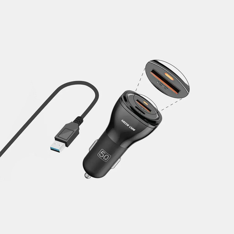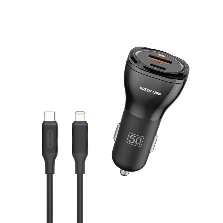 شارژر فندکی 30 وات 2 پورت گرین لاین مدل GNCC50WQPDBK به همراه کابل تبدیل USB-Cبه لایتنینگ
