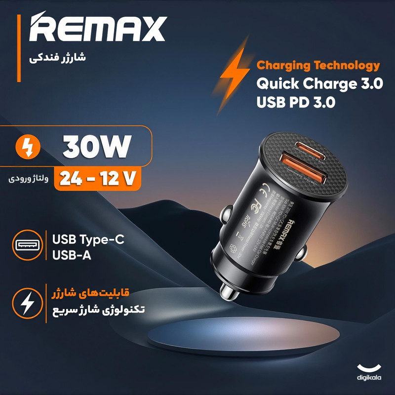 شارژر فندکی ریمکس مدل RCC358 محصولی از شرکت ریمکس است . این شارژر فندکی با توان خروجی 30 وات دارای دو پورت خروجی USB با ولتاژ و شدت جریان خروجی به ترتیب 4.5V-5A/9V-2A/12V-1.5A با ماکزیمم توان 22.5 وات و پورت Type-C با ولتاژ و شدت جریان خروجی به ترتیب 5V-3A/9V-3A/12V-2.5A با ماکزیمم توان 30 وات به صورت فست شارژ عمل کرده و گوشی موبایل و تبلت شما را سریع تر از هر زمانی شارژ می کند . سایز بسیار مناسب شارژر فندکی ریمکس مدل RCC358 باعث سهولت در حمل و نقل آن شده و هنگام قرار گیری در پورت فندکی خودرو به جایی گیر نمی کند و فضای اضافی را درگیر خود نمی کند.