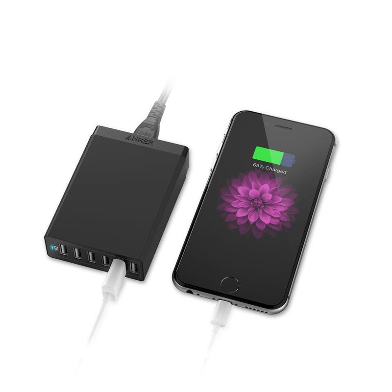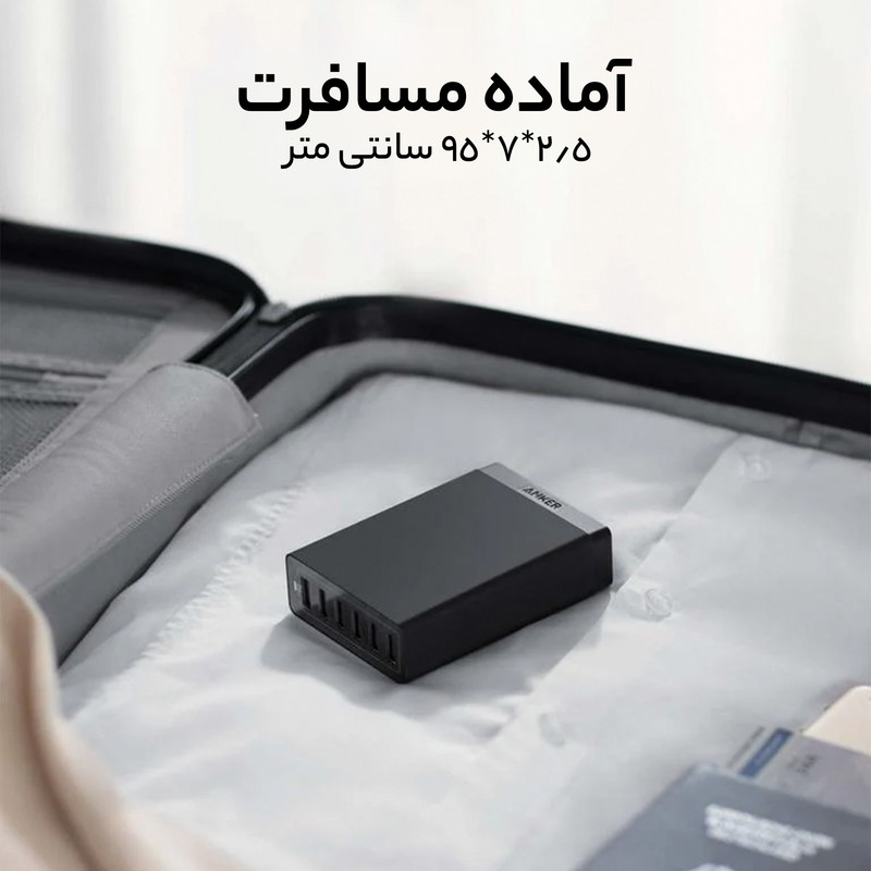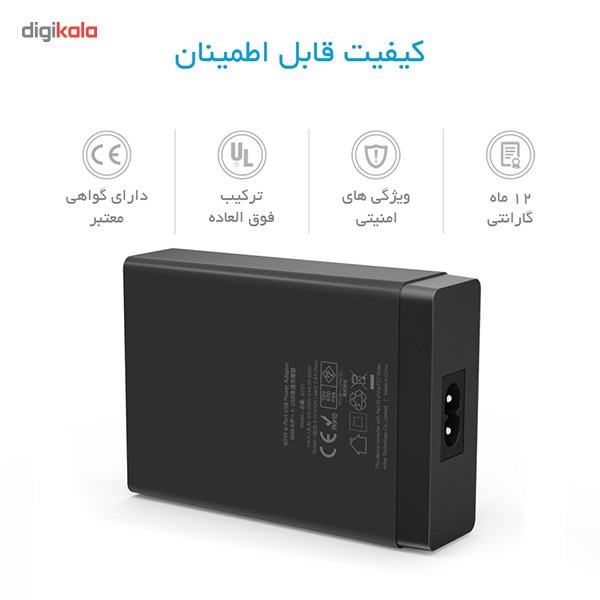 در این مدل از شارژرهای دیواری «انکر» 6 درگاه خروجی وجود دارد تا مشکلات ناشی از کمبود پریز برق را تا حد زیادی برطرف کند. بسیاری از افراد با معضل کمبود پریز برق و فضای کافی برای شارژ باتری دستگاههایی نظیر گوشی موبایل و تبلت در خانه و محل کار دست و پنجه نرم میکنند. این محصول میتواند باتری 6 دستگاه مختلف را بهطور همزمان شارژ کند تا این مشکل کمتر احساس شود. این شارژر 266 گرم وزن و ظاهری شبیه به یک مستطیل دارد. طول این مستطیل 99 میلیمتر، عرض آن 71.1 و ضخامتش حدود 25.4 میلیمتر است. روی بدنهی آن 6 درگاه خروجی USB 2.0 وجود دارد که امکان اتصال و شارژ 6 دستگاه به طور همزمان را برای شما فراهم میکند. حداکثر توان خروجی این شارژر 60 وات بوده و حداکثر شدت جریان خروجی آن در مجموع 12 آمپر است. البته جریان خروجی در هر یک از درگاههای خروجی این محصول به تنهایی 2.4 آمپر شدت دارد. برای استفاده از این محصول کافی است آن را با استفاده از کابل برق موجود در بستهبندی به یک پریز برق متصل کنید. در این حالت جریان برق درون شارژر جریان پیدا میکند. حالا میتوانید گوشی موبایل، تبلت و یا هر دستگاه دیگری را که قابلیت سازگاری با این شارژر دارد، با استفاده از یک کابل USB به آن متصل کنید تا باتری دستگاهتان بهصورت خودکار شارژ شود. ولتاژ ورودی در این محصول 100 تا 240 ولت و ولتاژ خروجی در آن 5 ولت است. در زمان استفاده از انواع شارژرهای دیواری، فندکی و پاوربانکها باید بهشدت جریان خروجی و نوع دستگاهی که قرار است باتری آن را شارژ کنید، توجه کرد. به طور مثال برای شارژشدن باتری انواع گوشیهای موبایل باید یک شارژر با حداقل شدت جریان خروجی 1 آمپر داشته باشید. این در حالی است که برای شارژشدن باتری تبلتها باید از یک شارژر با حداقل شدت جریان خروجی 2 آمپر استفاده کرد.