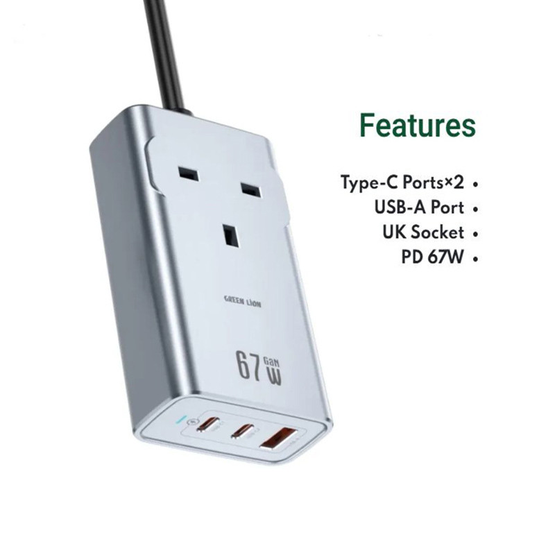 شارژر رومیزی گرین لاین مدل GL-WC21 توان خروجی برابر با 67 وات دارد و بر روی آن 3 پورت خروجی تعبیه شده است که شامل 2 پورت تایپ سی و یک پورت USB-A است. وجود چندین پورت روی بدنه این شارژر نیاز شما به انواع پورت را به خوبی برطرف می نماید. برای این شارژر همچنین یک پورت خروجی AC نیز تعبیه شده است که بیشینه توان خروجی آن 2200 وات است. از فناوری های به کار گرفته شده در این شارژر می توان به فناوری Gan اشاره کرد که این فناوری کمک می کند علاوه بر کوچک تر شدن ابعاد محصول، اتلاف حرارت کمتری نیز داشته باشد. ابعاد شارژر رومیزی GREEN LION بسیار جمع و جور می باشد و یک کابل برق متصل به طول 150 سانتی متر نیز برای آن طراحی شده است که این طول کابل سبب استفاده راحت تر از این محصول می شود.
