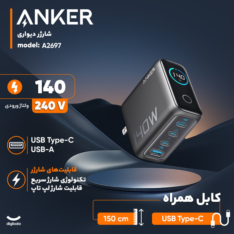 شارژر دیواری 140 وات انکر مدل A2697 به همراه کابل USB-C به طول 1.5 متر