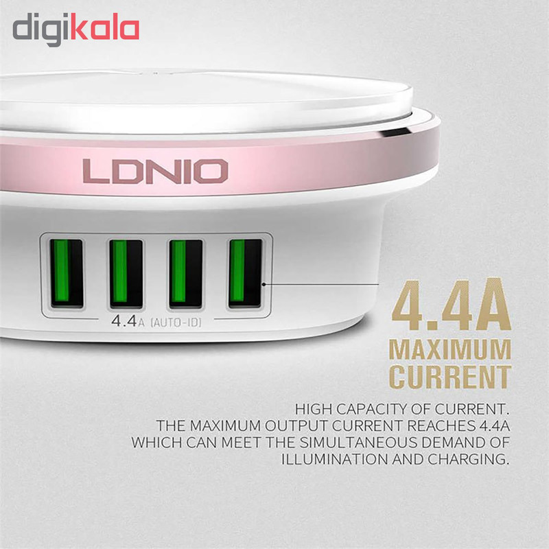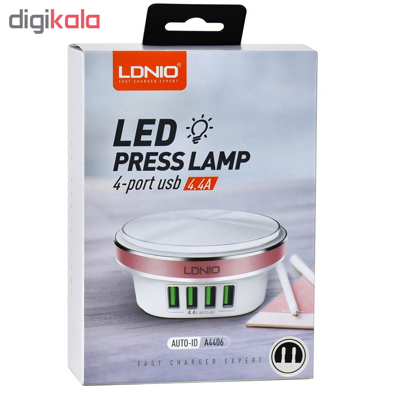 کمپانی الدینیو که از پبیشتازان در حوزه لوازم برقی است و همیشه با استفاده از جدیدترین تکنولوژی های روز و نیاز کاربران و تقاضای بازار،اقدام به تولید محصولات متنوع می کند.A4406 نام یکی از جدیدترین محصولات کمپانی الدینیو می باشد که در واقع هم یک شارژر و هم یک چراغ خواب رومیزی می باشد.بدنه ی این محصول از مواد اولیه مرغوب بوده و از مقاومت بالایی برخوردار است.در پنل رویی A4406 شاهد یک زائده با طرح انتزاعی شکیل و نوار فلزی دوربری شده با تکنولوژی CNC هستیم که در زیر آن لامپ LED به کار رفته است.میزان نوردهی این لامپ LED بسیار خوب بوده و به خوبی کار یک چراغ خواب را برایتان انجام می دهد و جهت روشن کردن لامپ این چراغ خواب، کافیست تنها قسمت مشخص شده روی قسمت رویی شارژر که مشخص شده است را با انگشتتان لمس کنید.از مزیت های هاب الدینیو A4406 برخورداری از 4 پورت USB جهت شارژردهی در لبه ی کناری این محصول می باشد.لازم است بدانید پورت های USB این محصول دارای تکنولوژی Auto-ID نیز می باشند که به رغم وجود این خصیصه این محصول این توانایی را یافته که شدت جریان خروجی را بسته به دستگاه متصل به آن به خوبی تنظیم و کنترل کند و به نوعی سبب افزایش عمر باتری دستگاه متصل نیز شود.توان خروجی این سه پورت 4.4 آمپر و 5 ولت بوده و لامپ های LED نیزی دارای حداکثر توان 2.4 وات می باشند البته تعداد لامپ های LED به کار رفته 12 عدد است.درجه حرارت لامپ این چراغ خواب 6500K می باشد.
