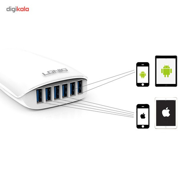 با استفاده از این شارژر رومیزی، شش دستگاه مختلف را بهطور همزمان به آن متصل کرده و باتری آنها را شارژ کنید. در مدل «A6573» از شارژرهای رومیزی «الدینیو» از یک کابل برق به طول 150 سانتیمتر بهره گرفته شده که قابلیت جدا شدن را دارد. برای استفاده از این محصول کافی است کابل برق را به شارژر متصل کرده و آن را به یک پریز برق متصل کنید؛ در این حالت جریان برق درون شارژر جریان پیدا میکند. حالا میتوانید گوشی موبایل، تبلت و یا هر دستگاه دیگری که قابلیت سازگاری با شدت جریان خروجی شارژر را داشته باشد، با استفاده از یک کابل USB به آن متصل کرده تا باتری دستگاه شارژ شود. روی بدنهی این محصول شش درگاه خروجی USB 3.0 وجود دارد. شدت جریان خروجی در دو درگاه این محصول 2 آمپر، در دو درگاه خروجی دیگر آن 2.4 آمپر و در دو درگاه آخر 1 آمپر است. همچنین حداکثر شدت جریان خروجی در هر 6 درگاه این محصول 5.4 آمپر خواهد بود. در زمان استفاده از انواع شارژرها باید به شدت جریان خروجی در آنها و دستگاهی که قرار است باتری آن را شارژ کنید، توجه داشته باشید. بهطور مثال برای شارژ شدن باتری انواع گوشیهای موبایل باید یک شارژر با حداقل شدت جریان خروجی 1 آمپر داشته باشید. این در حالی است که برای شارژ شدن باتری تبلتها باید از یک شارژر با حداقل شدت جریان خروجی 2 آمپر استفاده کرد. ولتاژ ورودی در این محصول 100 تا 240 ولت و ولتاژ خروجی در آن 5 ولت است. این محصول 400 گرم دارد و ظاهر آن شبیه به یک مستطیل با ضلعهای منحنی و طول 121.2 میلیمتر، عرض 75 و ارتفاع 33.8 میلیمتر طراحی شده است.
