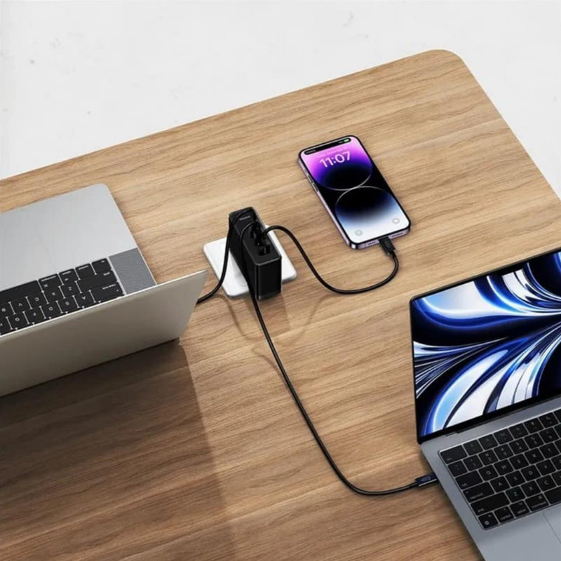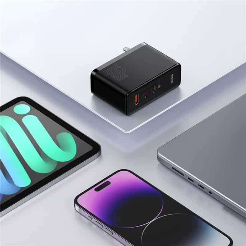شارژر دیواری GaN5 بیسوس دارای 3 پورت ورودی است که دو پورت آن Type-C و یک پورت USB بوده و شما میتوانید 3 دستگاه را به طور همزمان به شارژر متصل کنید و از شارژ سریع بهرهمند شوید. این شارژر پرطرفدار میتواند ولتاژ ورودی AC 110-240V~, 50/60Hz, 3.5A Max را پشتیبانی کند و دستگاههای متصل، با شدت جریان حداکثر 160 وات میتوانند نیرو دریافت کنند. این تقسیم نیرو به صورت زیر است: