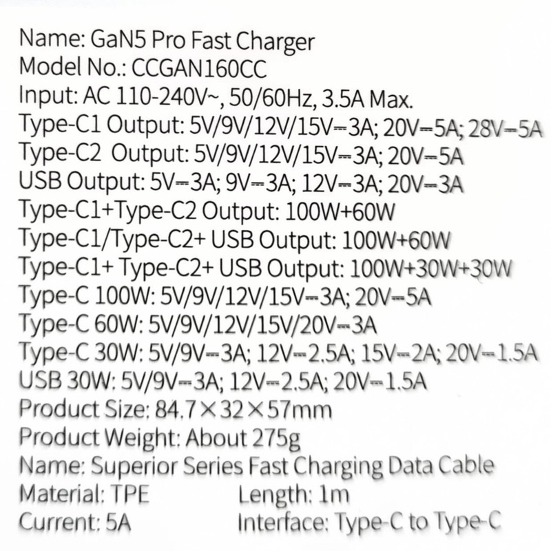 Type-C2 Output:5V / 9V / 12V / 15V / -3A ; 20V/5A (100.0W)