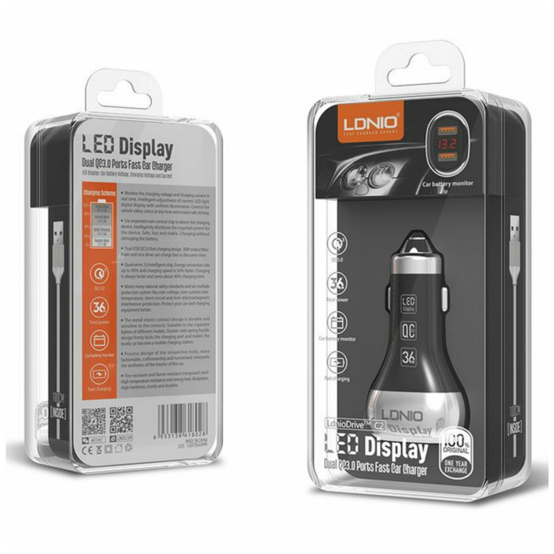 مدل C2 از سری شارژرهای《LDNIO》با استفاده از تکنولوژی شارژ سریع با توان 36 وات طراحی و ساخته شده است.با کمک این شارژر میتوانید موبایل یا تیلت خود را با سرعتی 80 درصد سریع تر از شارژرهای معمولی بدون هیچ گونه آسیب رسیدن به دستگاه خود شارژ کرده و در وقتتان صرفه جویی کنید.روی بدنه این شارژر دو درگاه USB با قابلیت فست شارژ(QC3.0) وجود دارد.فناوری voltage boost هم یکی دیگر از قابلیت های C1 است که با تشخیص مقاومت کابل به بهینه شدن ولتاژ و در نهایت شارژ سریعتر دستگاه شما کمک میکند این دستگاه دارای چراغ LED است که ولتاژ خروجی این شارژر را نشان میدهد.این شارژر دارای قابلیت AUTO ID است یعنی ولتاژ و جریان را مناسب با دستگاه شما وارد آن میکند و آسیب رسیدن به باطری دستگاهتان جلوگیری میکند.ولتاژ ورودی این شارژر ۱۲-۲۴ ولت و ولتاژ خروجی متغیر بین ۵، ۹ و ۱۲ ولت است و شدت جریان خروجی ۳ آمپر در ولتاژ ۵ ولت، ۲ آمپر در ولتاژ ۹ ولت و ۱٫۵ آمپر در ولتاژ ۱۲ ولت است.این شارژر دارای یک کابل فست شارژ USB-C با روکش TPE با قابلیت فست شارژ و انتقال دیتا نیز هست.یکی از ویژگی های مهم این شارژر محافظت در برابر نوسانات جریان و ولتاژ برق است این شارژر دارای استاندارد های ایمنی و سلامت محصول CE، FCC و RoHs است جنس بدنه این شارژر از فلز مقاوم و پلاستیک فشرده است.