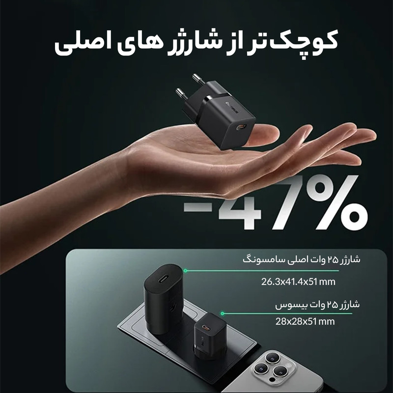 بدنه شارژر فست بیسوس مدل CCGAN25E5-M از PC ساخته شده و به راحتی حرارت داخلی را از سطح خارج میکند تا شارژر سریع داغ نشود. ابعاد این شارژر برابر با 28x51x28 میلیمتر است.