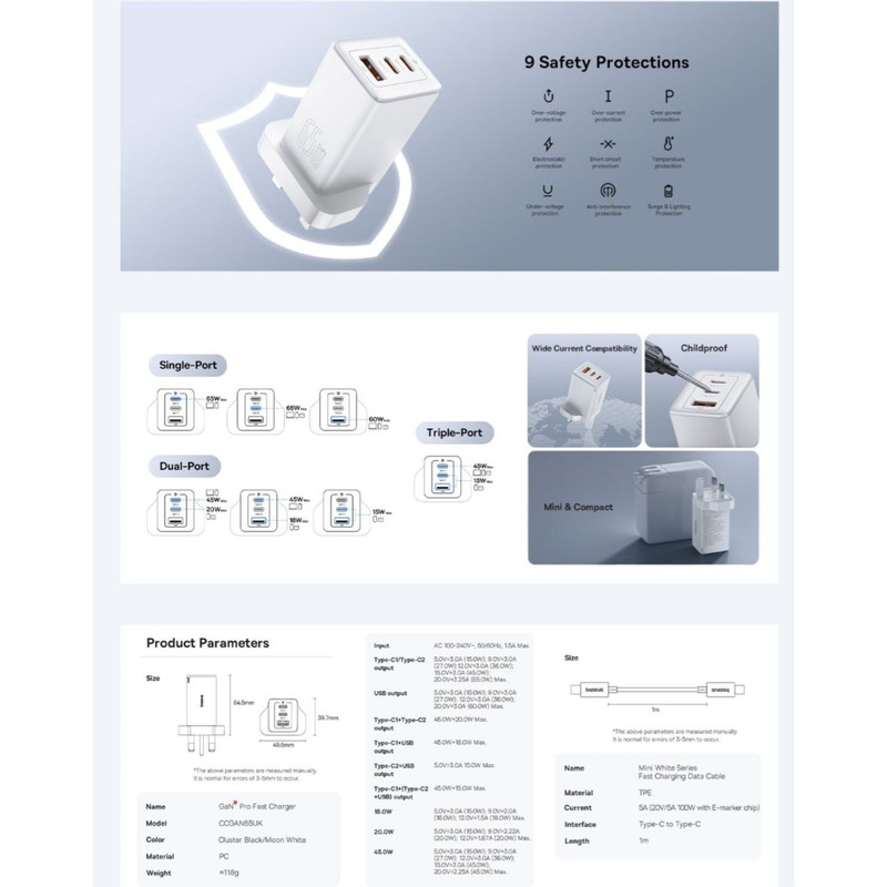 ویژگیهای ایمنی: شارژرهای Baseus معمولاً چندین ویژگی ایمنی را برای محافظت از دستگاههای شما در برابر جریان بیش از حد، ولتاژ بیش از حد، گرمای بیش از حد و اتصال کوتاه دارند و از شارژ ایمن و قابل اطمینان اطمینان میدهند.