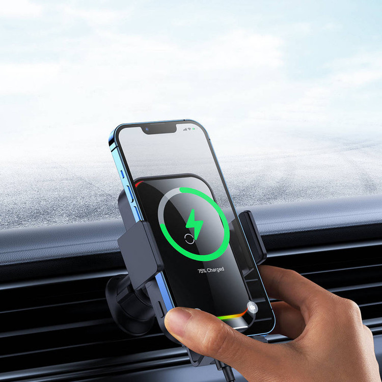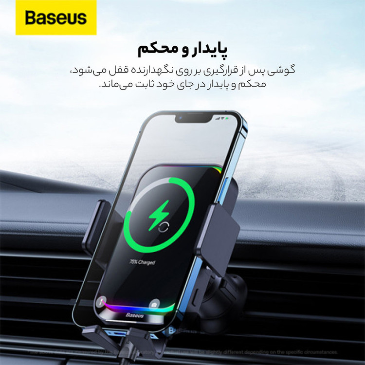 توان خروجی 15 وات / تنظیم 360 درجه تنظیم زوایه گوشی / باز و بست الکتریکی گیره / امکان خاموش کردن شارژر وایرلس و نورپردازی / دارای 7 جلوه نورانی زیبا / شارژر وایرلس و نگهدارنده موبایل خودرو