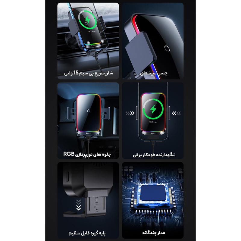 توان خروجی 15 وات / تنظیم 360 درجه تنظیم زوایه گوشی / باز و بست الکتریکی گیره / امکان خاموش کردن شارژر وایرلس و نورپردازی / دارای 7 جلوه نورانی زیبا / شارژر وایرلس و نگهدارنده موبایل خودرو
