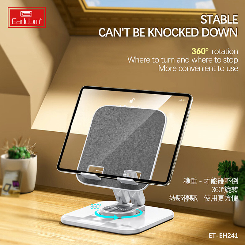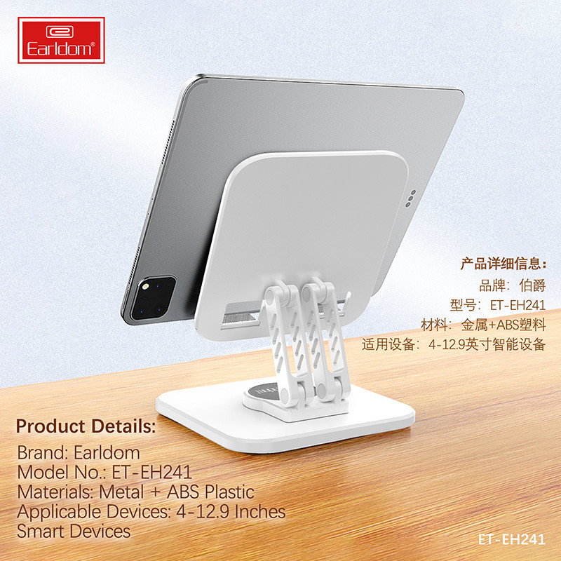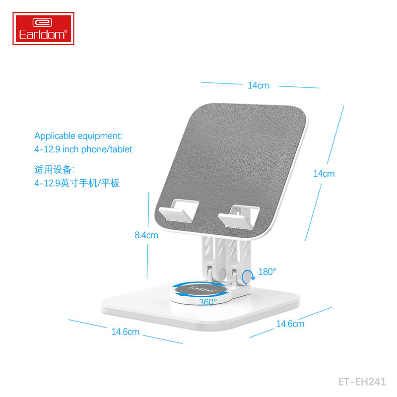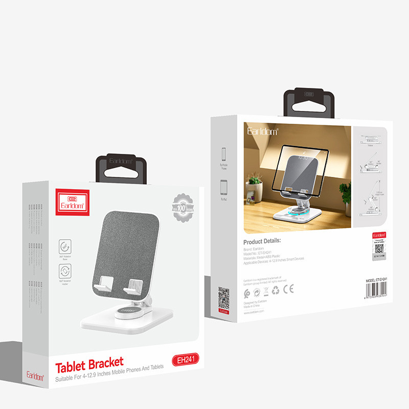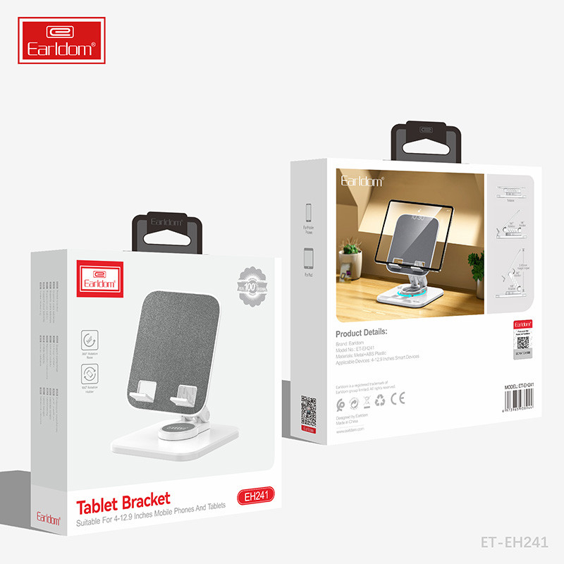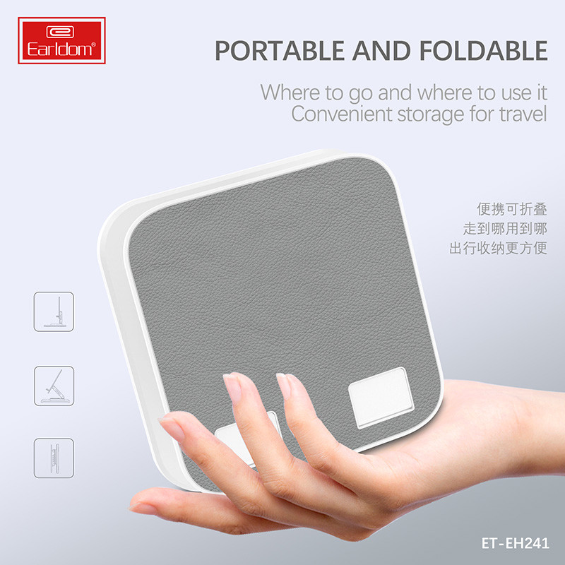 امروزه هولدر های بسیاری در بازار موجود هستند که هر کدام کارایی مخصوص به خود را دارند. هولدر و پایه نگهدارنده ET-EH241 محصولی از برند EARLDOM بوده که برای نگهداری گوشی موبایل بر روی میز بسیار مناسب است و قادر هست حتی تبلت شما را هم بر روی خود جای دهد. با این هولدر دیگر نیازی به نگه داشتن گوشی در دست نیست و می توانید بسیار راحت تر به دیدن فیلم و... بپردازید و به راحتی زاویه دید را تغییر داده و حتی گوشیتان را به شارژ متصل کنید. طراحی ابعاد این هولدر و پایه نگهدارنده EH241 هولدر رومیزی EARLDOM دارای طراحی بسیار زیبایی و قابلیت تا شدن را دارا می باشد. این قابلیت باعث می شود شما بتوانید این هولدر را با خود به هرجایی حمل کرده و از آن استفاده کنید. باز و بسته کردن این هولدر به سادگی اتفاق می افتند و کافی است با یک دست آن را به سمت بالا کشیده تا باز شود. بعلاوه شما می توانید تا 360 درجه این هولدر را تنظیم کرده و با توجه به زاویه مورد نظر از هولدر رومیزی EH241 استفاده کنید. قسمت نگهدارنده گوشی به صورت باز طراحی شده که شما بتوانید دستگاه مورد نظر را هنگام استفاده از هولدر به شارژ متصل کنید. البته لازم است که درگاه شارژ دستگاه شما در قسمت پایین و وسط قرار داشته باشد. قسمت پایه و پد نگهدارنده ی هولدر رومیزی EH143 سیلیکونی و ضد لغزش طراحی شده که باعث می شود شما با خیالی راحت از هولدر استفاده کنید؛ بعلاوه این پد بر روی دستگاه و میز شما خط نمی اندازد. هولدر و پایه نگهدارنده EARLDOM این هولدر پایه نگهدارنده از گوش های هوشمند با حداکثر قطر 7 اینچ را پشتیبانی می کند.