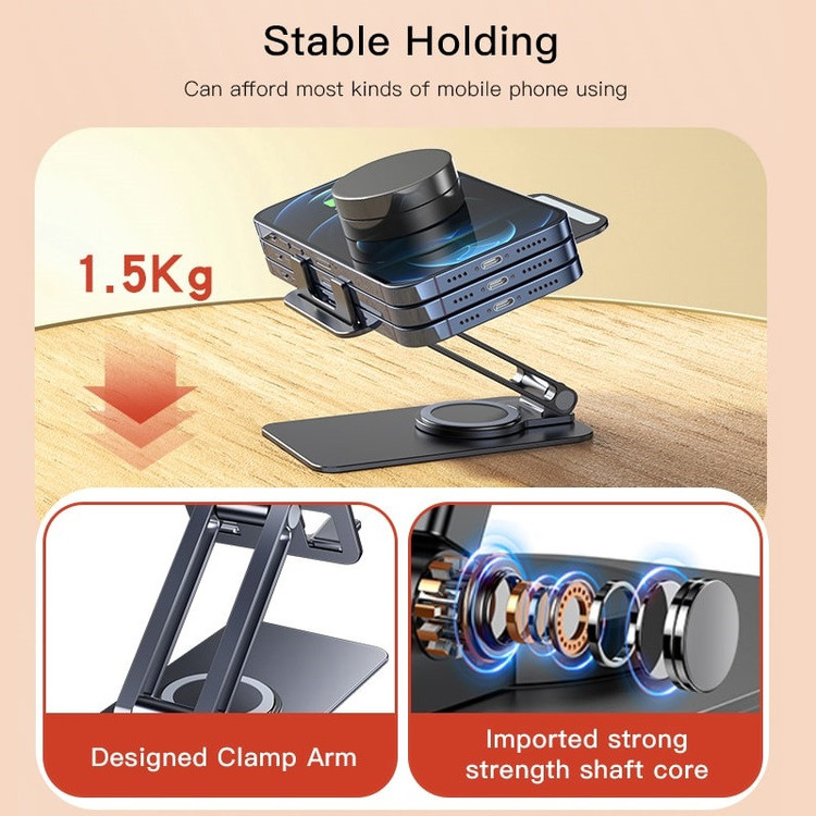 شیار عبور کابل شارژ دارد جنس بدنه آلیاژ آلومینیوم قابلیت چرخش 360 درجه مقاوم در برابر فشار و ضربه دارد قابلیت تا شدن دارد حداکثر وزن قابل تحمل 1.5 کیلوگرم