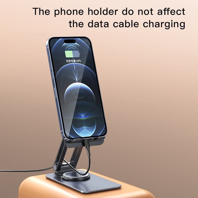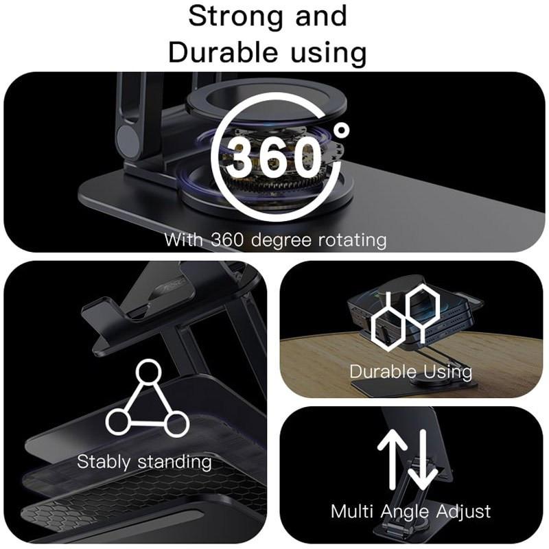 شیار عبور کابل شارژ دارد جنس بدنه آلیاژ آلومینیوم قابلیت چرخش 360 درجه مقاوم در برابر فشار و ضربه دارد قابلیت تا شدن دارد حداکثر وزن قابل تحمل 1.5 کیلوگرم