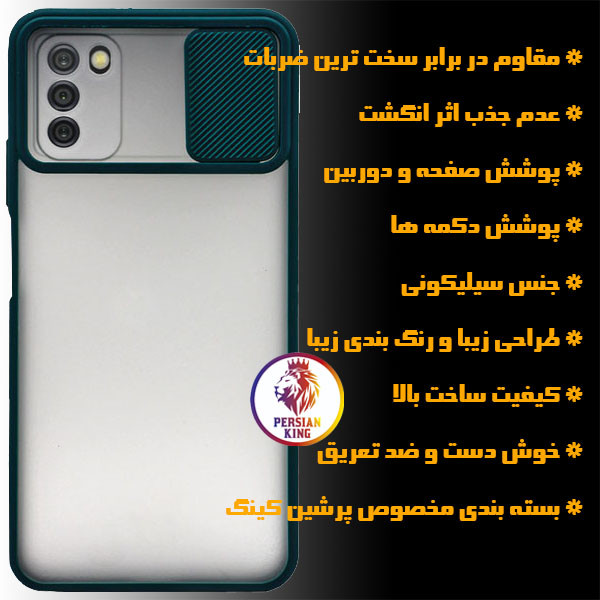 کاور پرشین کینگ مناسب گوشی موبایل سامسونگ Galaxy A03S / A02S از سیلیکون مقاومی در اطراف و طلق مات در پشت گوشی ساخته شده است که برای آنکه روی گوشی به راحتی نصب شود دورتادور آن نرم ساخته شده است. دوام و مقاومت بالای قاب محافظ باعث شده کاربران بتوانند با اطمینان خاطر از آن استفاده کنند. در نتیجه استفاده از آن، فشاری به گوشی هوشمند وارد نخواهد کرد.قاب کینگ پاور PMK22 طراحی استانداردی دارد. به همین دلیل محل قرارگیری کلیدها، پورت ها و دوربین با برش های دقیقی باز شده است و کاربران برای دسترسی به این امکانات گوشی مشکلی نخواهند داشت. همچنین قاب کینگ پاور PMK22 دارای یک محافظ کشویی نیز میباشد که با قرار دادن آن روی دوربین مانع از ایجاد خراشیدگی و ضرب دیدگی لنز دوربین گوشی شما خواهد شد و پوشش 100 درصدی را ایجاد میکند.