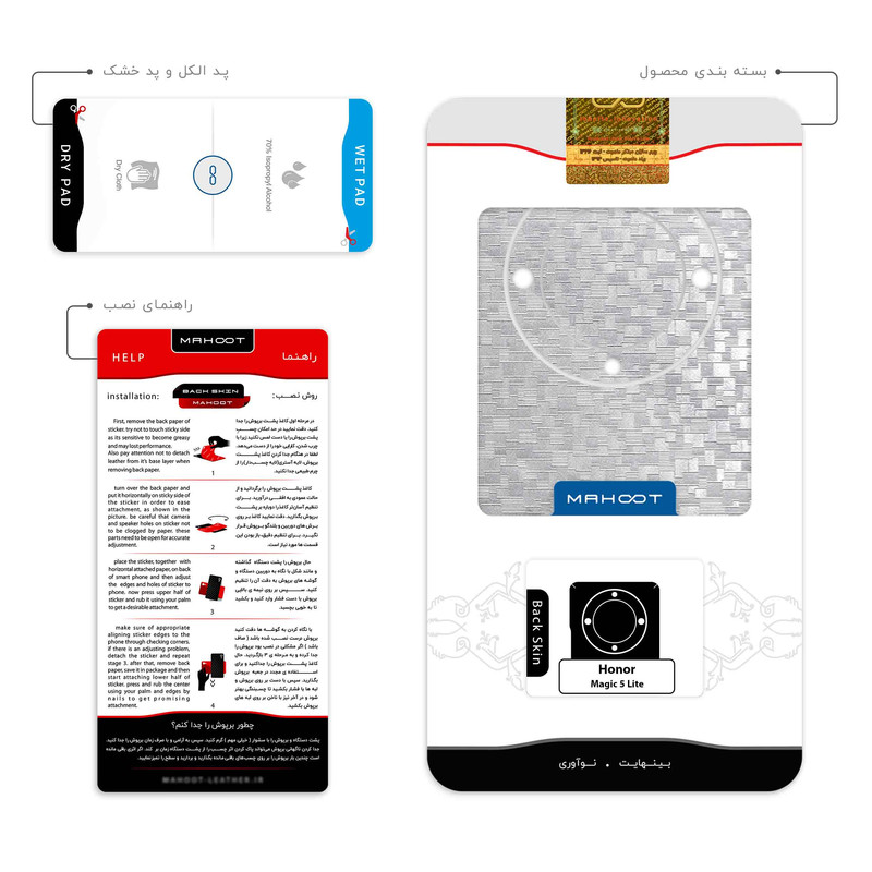 ضخامت 0.2 میلیمتر سری محصول: بافتدار سطح مقاوم در برابر مواد شیمیایی و ساییدگی ضخامت کم چسبندگی بالا امكان استفاده همزمان با گارد و بامپر محتویات جعبه: برپوش ماهوت- پد الکل -راهنما تصویر-کاردک ویژه نصب