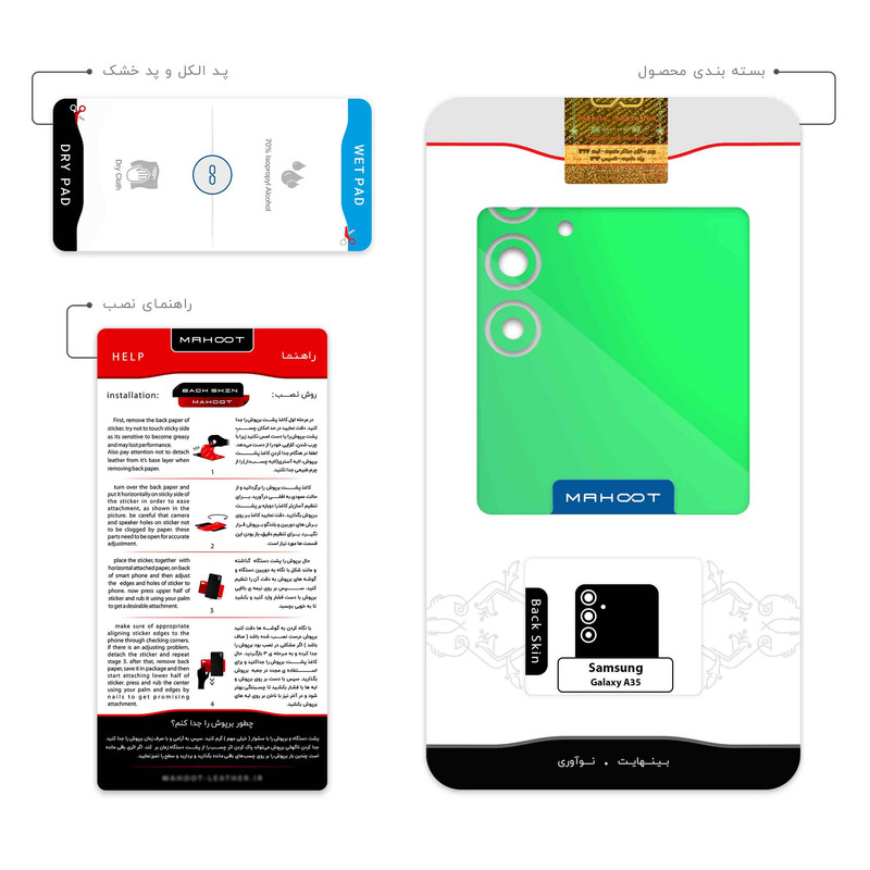 ضخامت 0.2 میلیمتر سری محصول: بافتدار سطح مقاوم در برابر مواد شیمیایی و ساییدگی ضخامت کم چسبندگی بالا امكان استفاده همزمان با گارد و بامپر محتویات جعبه: برپوش ماهوت- پد الکل -راهنما تصویر-کاردک ویژه نصب