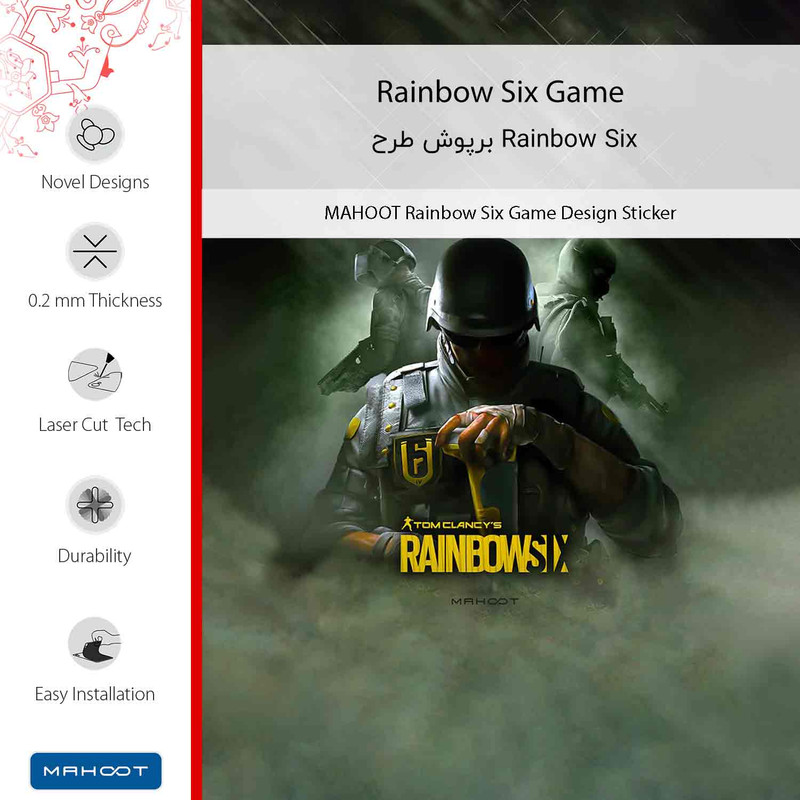 طرح بازی ویدیویی Rainbow Six، محصولِ برند ماهوت میباشد.در توضیح ساختار فنی برپوش طرح میتوان گفت تصویر بر روی لایه اولِ برپوش، مستقیما با یک تکنیک منحصربفرد چاپ میشود. همچنین بخش چسبنده دارای تکنولوژی Bubble Free است که نصب را آسان و چسبندگی را حداکثر میکند و هیچ اثری از چسب، بر روی دستگاه هوشمند باقی نمیگذارد. در لایه دوم یک ورق لمینت گرم، با دستگاههای مخصوص در دمای بالا بر روی لایه اول اعمال می شود تا مقاومت در برابر مواد شیمیایی و خط و خش حداکثر شود. همچنین برپوش طرح به طور کامل در برابر آب مقاوم است. نام دیگر این محصول برپوش است که نوعي استيكر(برچسب) چندلايه است و به منظور پوشش سطح پشت گوشي هوشمند ساخته شده است و كنارههاي دستگاه را پوشش نميدهد. هدف استفاده از آن ايجاد طرح، رنگ و احساسي نو براي دستگاه هوشمند است، در حالي كه زبان طراحي و ظرافت گوشي هوشمند حفظ شود. لازم به ذکر است که برپوش با وجود چسبندگي بالا هيچي اثري از خود هنگام جدا شدن برجاي نميگذارد. همچنین جنس برپوش از پليكربنات است و اين ماده تاثير قابل توجهي بر روي آنتن دهي و يا دفع حرارت گوشي هوشمند نخواهد داشت و اگر دستورالعمل نصب و جدا كردن به شيوه صحيح اجرا شود با توجه به ساختار چندلايه آن ميتوان برپوش را چندين بار استفاده كرد.