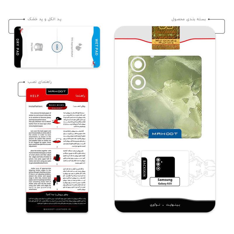 ضخامت 0.2 میلیمتر سری محصول: طرح سطح مقاوم در برابر مواد شیمیایی و ساییدگی ضخامت کم چسبندگی بالا امكان استفاده همزمان با گارد و بامپر محتویات جعبه: برپوش ماهوت- پد الکل -راهنما تصویر-کاردک ویژه نصب