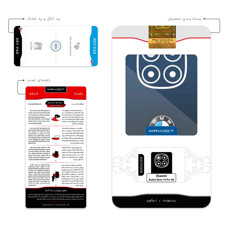 ضخامت 0.2 میلیمتر سری محصول: طرح سطح مقاوم در برابر مواد شیمیایی و ساییدگی ضخامت کم چسبندگی بالا امكان استفاده همزمان با گارد و بامپر محتویات جعبه: برپوش ماهوت- پد الکل -راهنما تصویر-کاردک ویژه نصب