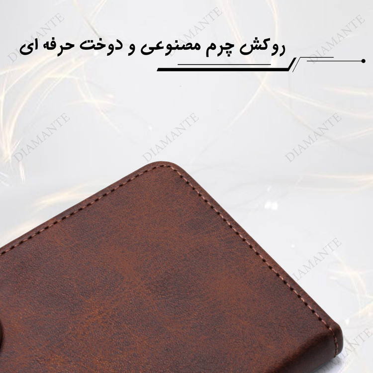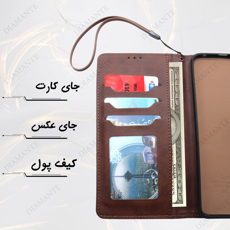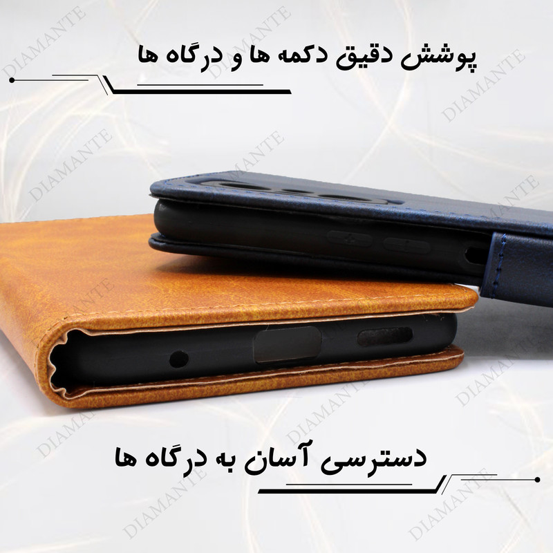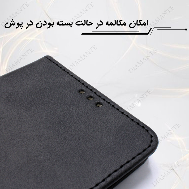 قابلیت استفاده به صورت استند دارای جای کارت و وجه نقد چرم مصنوعی با کیفیت کاربردی و مقاوم کیفیت دوخت بالا دارای قفل آهنربایی رنگ بندی متنوع برش دقیق درگاه ها پوشش کامل درگاه ها دارای محافظ لنز