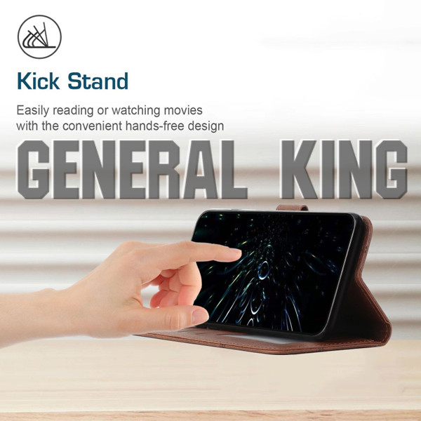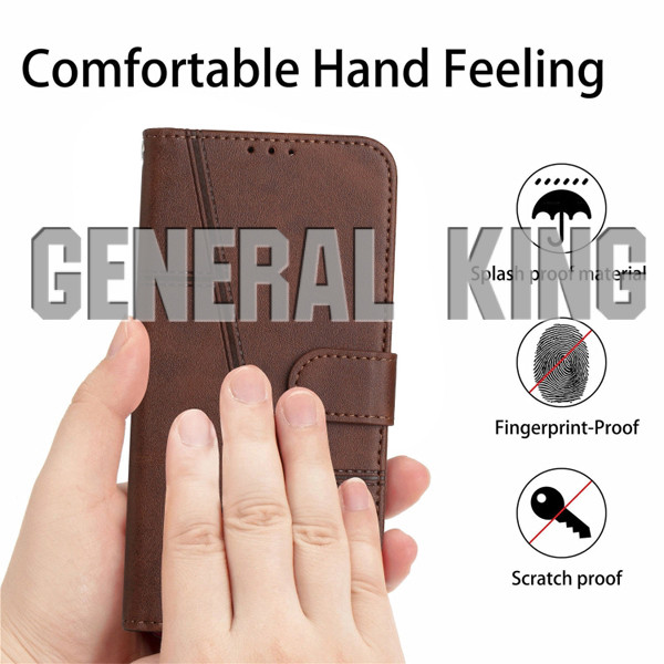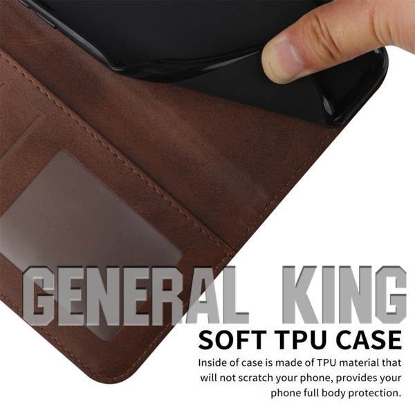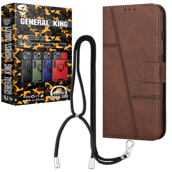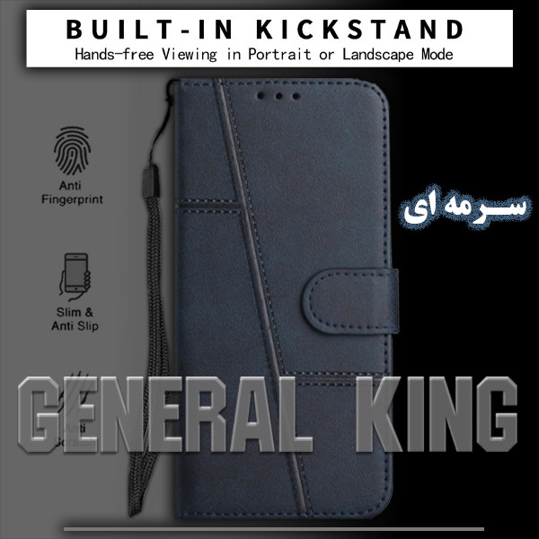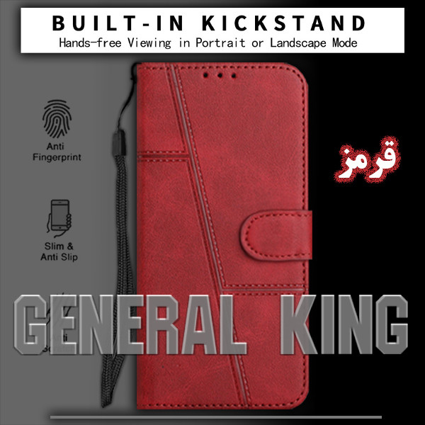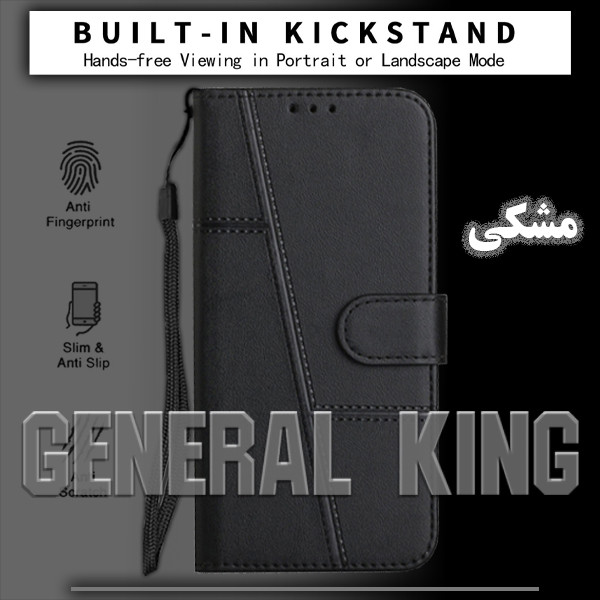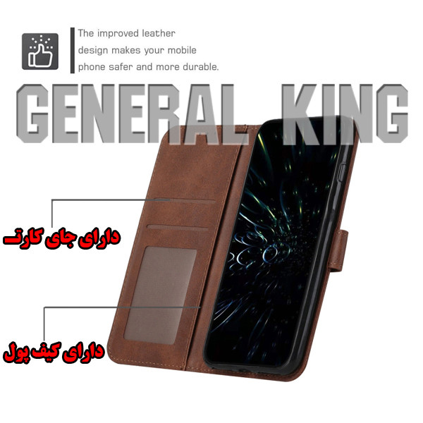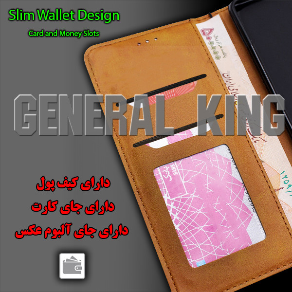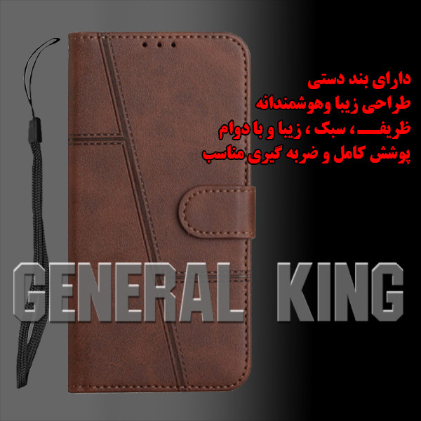 کیف چرمی کلاسوری ژنرال کینگ به همراه بند آویز از چرم و TPU باکیفیت ساخته شده است که می توانید برای نگهداری ایمن و زیبای گوشی خود از آن استفاده نمایید. اولین نکته که هنگام باز کردن درب کیف متوجه آن می شویم، وجود بندی با دکمه ی آهن ربایی است که به محکم بسته شدن آن کمک می کند و از محتویات داخل کیف به بهترین شکل مراقبت میکند. این طراحی مدرن در قالبی از جنس و مواد با کیفیت به شما کمک می کند تا تمام لوازم ضروری خود مانند گوشی، پول نقد و کارت های اعتباری خود را در کیف چرمی بسیار خوش دست و زیبا در اختیار داشته باشید. دورتادور این قاب منعطف بوده و گوشی به راحتی داخل قابی که روی کیف وجود دارد قرار میگرد. این قاب به طور کامل بدنه ی گوشی را می پوشاند البته محل پورتها و دوربین به دقت برش خورده است و حتی برای شارژ نیازی به بیرون آوردن گوشی از کاور وجود ندارد. همچنین در قسمت کناری کیف، بند مچی ای تعبیه شده باعث جلوگیری از سقوط ناگهانی گوشی و یا سرقت آن می شود. یکی دیگر از امکانات این کیف کلاسوری ژنرال کینگ قابلیت استند شدن آن است که میتوانید در این صورت توسط درب کیف، کیف را تبدیل به استند کرده و گوشی را روی سطح صاف مانند میز قرار داده وبه تماشای موزیک ویدئو یا فیلم بپردازید.