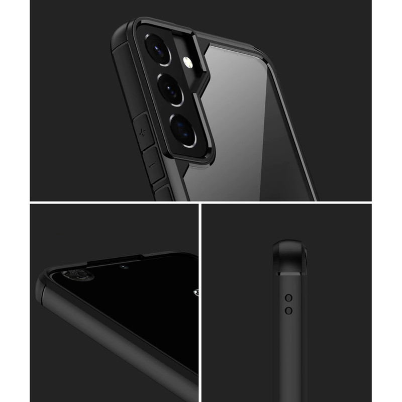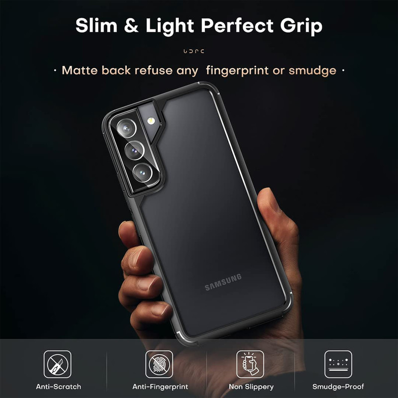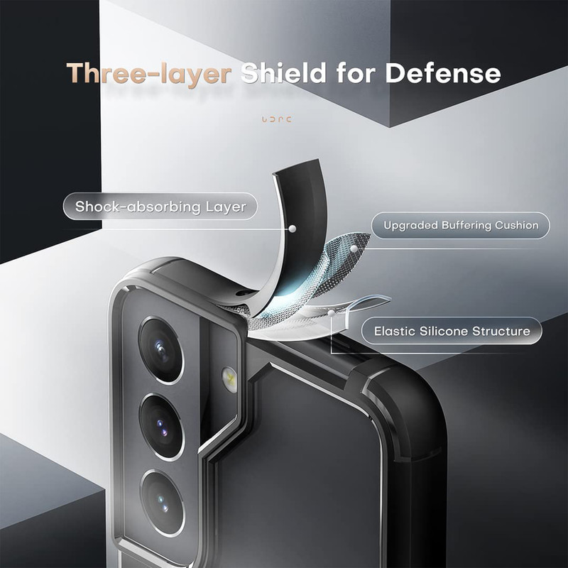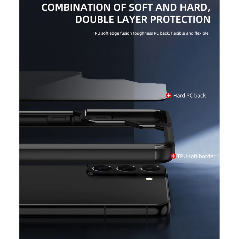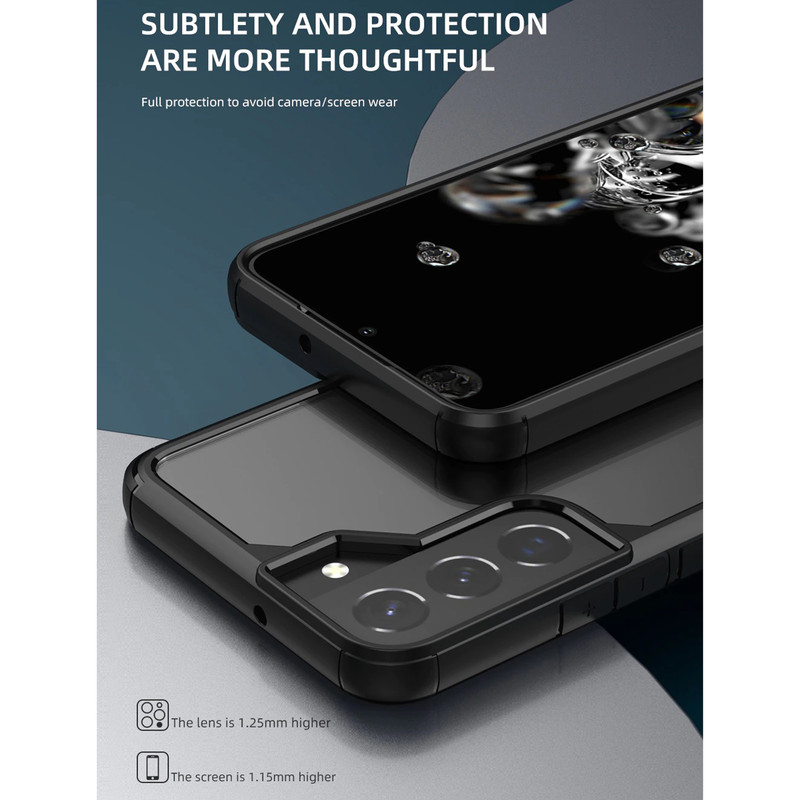کاور گوشی سامسونگ Galaxy S22 سری Shock Proof Case محافظی ساده است که به دور از هر گونه زرق و برق از گوشی شما در برابر ضربه و سقوط به خوبی محافظت می کند. روکش قاب کاملا صاف و یکدست بوده و احساس خوشایندی به کاربر در هنگام کار با گوشی منتقل میکند. سطح و جنس کاور از پلاستیک با کیفیت و نسبتا نرمی ساخته شده است که به راحتی گوشی درون کاور جای گرفته و هنگام کار محدودیتی برای کار با دوربین، پورت ها و دکمه ها نخواهید داشت. ساختار این قاب از دو بخش به هم پیوند خورده تشکیل شده است. بخش اول بدنه ی اصلی قاب است که با نمای شفاف خود پشت گوشی را می پوشاند و از گوشی شما در برابر خط و خش و ضربات احتمالی حفاظت میکند. بخش دوم بامپری است که با ایجاد لایه ای ضخیم تر، دورتادور گوشی را پوشانده و آن را در برابر سقوط و ضربه های شدید ایمن نگه می دارد.