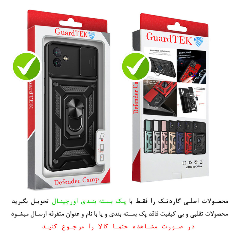 سری قابهای گارد تک مدل Dcamp2 ویژه افرادی با روحیه هیجانی و پر از شور و شعف طراحی شده است. قاب محافظ گارد تک مدل Dcamp2 از مواد PU و TPU تولیده شدهاند. این نوع پلاستیک به دلیل دوام بسیار خوبی که دارد برای ساخت قطعات داخلی اتومبیل مورد استفاده قرار میگیرد. مواد پلاستیک PU و TPU به کار رفته در تولید این محافظها را به صورت دو لایه به کار گرفته است. در نتیجه این قابها، نسبت به سایر قابهای محافظ در برابر ضربه، خط و خش، سایش و سایر آسیبهای معمول که به موبایل سامسونگ Galaxy A04 وارد میشود، ز ظاهر خاص این قابها که بگذریم باید گفت با طراحی استاندارد این محافظان گوشی، محل قرارگیری دوربین، سنسور و سایر پورتهای گوشی باز است و کاربران برای کار با این امکانات گوشی مشکلی نخواهند داشت. اما برای افزایش حس خشن این قاب روی کلیدهای گوشی با پوسته نازکی به صورت برجسته پوشیده شده است تا کاربران برای لمس کلیدها و کار با آنها مشکلی نداشته باشند.یکی از مهمترین ویژگی های این قاب وجود حلقه نگهدارنده در پشت قاب است که شما میتوانید از حلقه ای که به این قاب متصل است در موارد گوناگون استفاده کنید. برای نمونه: با قرار دادن انگشت دورن حلقه، گوشی کاملا در دست محکم می شود و احتمال افتادن گوشی از دست از بین میبرد. یا میتوانید با چرخاندن حلقه کاور را به حالت استند در بیاورید و به تماشای فیلم بپردازید. همچنین این حلقه نگهدارنده باداشتن حالت آهن ربایی می تواند به خوبی روی هولدرهای آهنربایی داخل خودرو بچسبد و دیگر نیازی به استفاده از برچسبهای آهن ربایی مجزا نخواهید داشت. همچنین دیگر نباید نگران به جای ماندن اثر انگشت بر روی قاب گوشی خود نباشید چرا که اثر انگشت بر روی این قاب نمیماند.