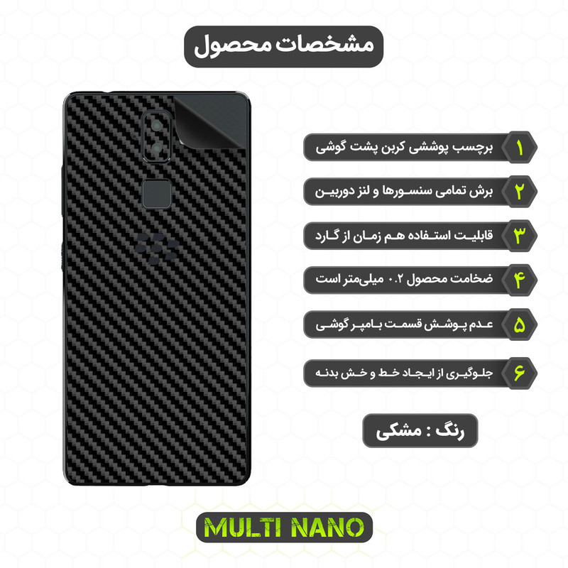 برچسب پوششی طرح کربنی Multi Nano به منظور محافظت در برابر خط و خش و ایجاد طرح و رنگی نو برای پشت گوشی موبایل شما طراحی و تولید شده است. به مرور زمان گرد و غبارهایی که بین گارد و پشت گوشی قرار میگیرند، خط و خشهایی روی بدنه ایجاد میکنند که باعث کاهش زیبایی و همچنین کاهش ارزش گوشی شما میشود. پیشنهاد میشود در کنار کاور های شفاف یا دور رنگی موجود در بازار، از برچسب پوششی کربنی مولتی نانو استفاده کنید تا گوشی شما در برابر آسیب های احتمالی در امان باشد. جنس این برچسب به گونهای است که ثبات رنگ دارد و رنگ آن به مرور زمان تغییر نمیکند، همچنین این محصول خاصیت ضد لک و ضد اثر انگشت دارد، که تجربه بهتری برای شما رقم میزند. این برچسب به منظور پوشش پشت بدنه و قسمت دوربین گوشی ( موبایل BlackBerry Evolve ) طراحی و تولید شده است و اطراف گوشی را پوشش نمیدهد. ضخامت این برچسب 0.2 میلیمتر می باشد، که از ظرافت گوشی شما کم نمیکند و ظاهری جذاب و متفاوت به گوشی ( موبایل بلک بری اوولو ) میدهد.