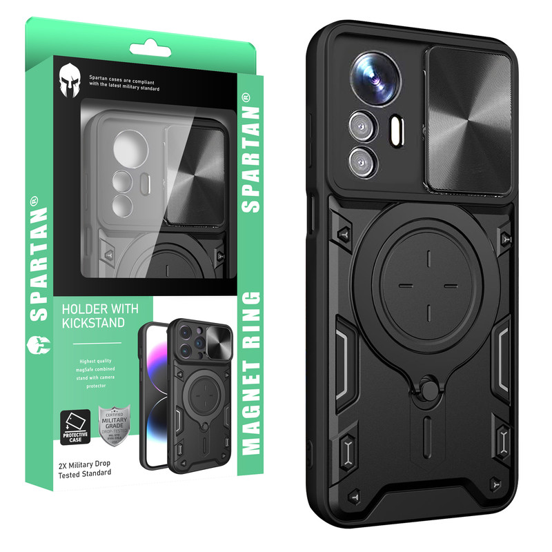سری قابهای اسپارتان مدل Magnet Ring ویژه افرادی با روحیه هیجانی و پر از شور و شعف طراحی شده است. قاب محافظ اسپارتان مدل Magnet Ring از مواد PU و TPU تولیده شدهاند. این نوع پلاستیک به دلیل دوام بسیار خوبی که دارد برای ساخت قطعات داخلی اتومبیل مورد استفاده قرار میگیرد. مواد پلاستیک PU و TPU به کار رفته در تولید این محافظها را به صورت دو لایه به کار گرفته است. در نتیجه این قابها، نسبت به سایر قابهای محافظ در برابر ضربه، خط و خش، سایش و سایر آسیبهای معمول که به گوشی موبایل وارد میشود، ز ظاهر خاص این قابها که بگذریم باید گفت با طراحی استاندارد این محافظان گوشی، محل قرارگیری دوربین، سنسور و سایر پورتهای گوشی باز است و کاربران برای کار با این امکانات گوشی مشکلی نخواهند داشت. اما برای افزایش حس خشن این قاب روی کلیدهای گوشی با پوسته نازکی به صورت برجسته پوشیده شده است تا کاربران برای لمس کلیدها و کار با آنها مشکلی نداشته باشند.یکی از مهمترین ویژگی های این قاب وجود حلقه نگهدارنده در پشت قاب است که شما میتوانید از حلقه ای که به این قاب متصل است در موارد گوناگون استفاده کنید. برای نمونه: با قرار دادن انگشت دورن حلقه، گوشی کاملا در دست محکم می شود و احتمال افتادن گوشی از دست از بین میبرد. یا میتوانید با چرخاندن حلقه کاور را به حالت استند در بیاورید و به تماشای فیلم بپردازید. همچنین این حلقه نگهدارنده باداشتن حالت آهن ربایی می تواند به خوبی روی هولدرهای آهنربایی داخل خودرو بچسبد و دیگر نیازی به استفاده از برچسبهای آهن ربایی مجزا نخواهید داشت. همچنین دیگر نباید نگران به جای ماندن اثر انگشت بر روی قاب گوشی خود نباشید چرا که اثر انگشت بر روی این قاب نمیماند.