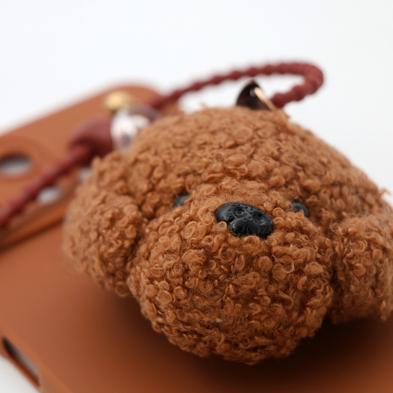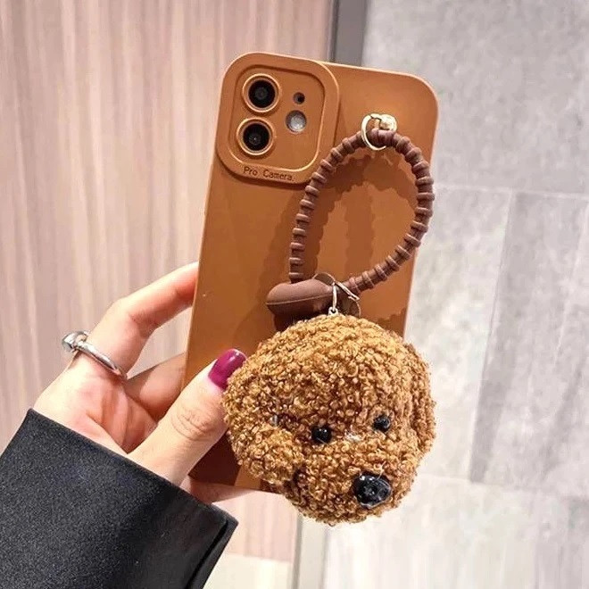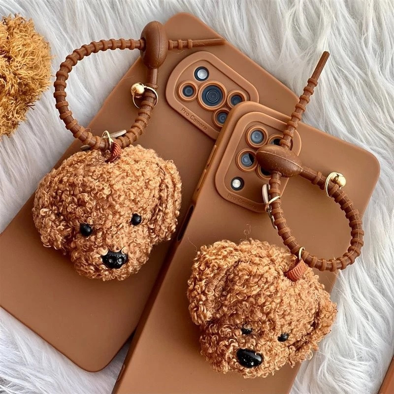 پوشش دور تا دور به همراه یک بند آویز قهوه ای با آویزهای عروسکی کیوت و یک سگ پشمالوی طوسی، دارای یک برش مربعی برجسته در اطراف لنز دوربین گوشی برای حفاظت بیشتر، دارای حاشیه از کلمه انگلیسی برند Pro Camera در کناره لنز دوربین، پوشش دکمه ها، بدون تغییر رنگ.