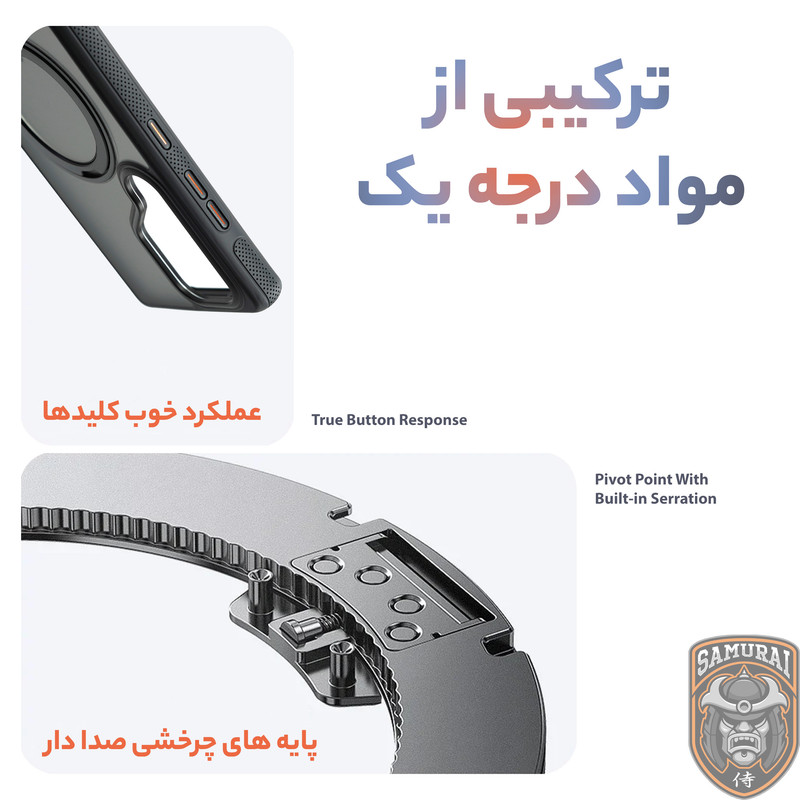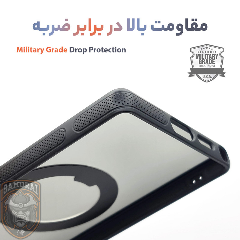 پشتیبانی کامل از مگسیف، استفاده از شارژر و لوازم جانبی بیسیم را ساده کرده و طراحی ضد لغزش در کنارهها باعث میشود گوشی بهخوبی در دست قرار بگیرد و لیز نخورد. متریال باکیفیت و دوام بالا، این قاب را به گزینهای مطمئن برای محافظت از Samsung Galaxy S25 Ultra تبدیل کرده است. اگر بهدنبال قابی مقاوم، مگسیفدار و دارای استند چرخان هستید، سامورایی مدل Vetro یکی از بهترین انتخابها است.