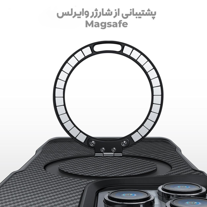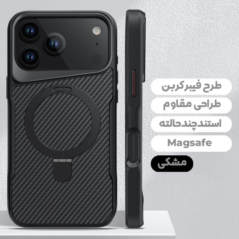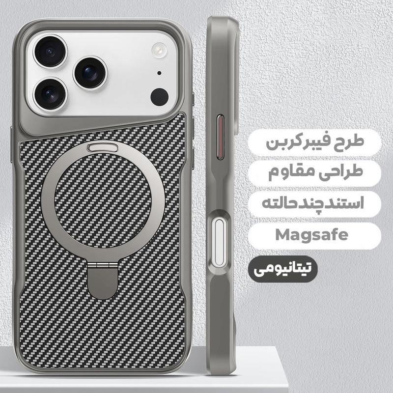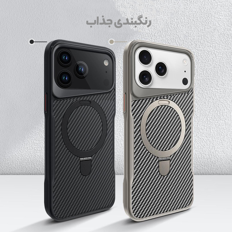 کاور بادیگارد مدل Carbon Stand برای iPhone 17 Pro یک انتخاب ایدهآل برای کاربرانی است که همزمان به دنبال استحکام، زیبایی و کارایی هستند؛ این کاور با طراحی الیاف فیبرکربن و جزئیات دقیق، جلوهای لوکس و مدرن به گوشی میدهد و در عین حال با لبههای مقاوم، محافظت کاملی در برابر ضربه و خط و خش فراهم میکند. وجود حلقهی مغناطیسی داخلی با ۲۶ آهنربای قدرتمند باعث میشود که این کاور کاملاً با سیستم MagSafe سازگار بوده و اتصال مطمئن به شارژرهای بیسیم و انواع هولدرهای مغناطیسی خودرو یا رومیزی داشته باشد. طراحی چندحالتهی حلقه پشتی امکان استفاده به عنوان استند در زوایای مختلف را فراهم میکند، بنابراین کاربر میتواند به راحتی برای تماشای فیلم، تماس تصویری یا مطالعه از آن استفاده کند. حلقهی آلومینیومی با دوام و قابلیت چرخش، هم کارکرد استند و هم محافظت بیشتر در دست گرفتن گوشی را تضمین میکند. فرم بدنه با طراحی کمری (باریک در قسمت میانی) باعث خوشدستی بیشتر شده و مانع لغزش گوشی در دست میشود. این کاور در رنگبندی مشکی و خاکستری-تیتانیومی عرضه شده که پاسخگوی سلیقههای مختلف است و ظاهر گوشی را شیکتر و مدرنتر میسازد. در مجموع، بادیگارد با این محصول ترکیبی از مقاومت بالا، طراحی زیبا و کارکرد چندگانه را در اختیار کاربران iPhone 17 Pro قرار داده تا گوشی گرانقیمتشان در هر شرایطی ایمن و در عین حال کاربردی باقی بماند.