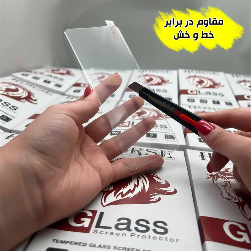 امروزه یکی از بزرگترین مشکلات گوشی های اج یا خمیده نصب محافظ صفحه نمایش بر روی آنهاست که این محافظ صفحه نمایش ها یا کامل صفحه نمایش را پوشش نمی دهند یا به دلیل خمیده بودن لبه ها محافظ صفحه نمایش های فول هم از کناره ها بلند می شوند یا زیر آنها پرز و گرد و غبار می رود. برای حل این موضوع شرکت هورس محافظ صفحه نمایش های جدیدی را روانه بازار کرده که این مشکلات را برای گوشی های خمیده حل کرده است. محافظ صفحه نمایش های UV Light دارای یک مایع مخصوص است که شما بر روی صفحه نمایش خود می ریزید سپس گلس را روی آن قرار می دهید ، مایع به تدریج کل صفحه را فرا می گیرد همچنان می توانید گلس را جا به جا کنید تا به بهترین حالت روی صفحه نمایش شما قرار بگیرد و وقتی گلس به خوبی بر روی صفحه قرار گرفت بیش از 120 ثانیه صبر کنید و سپس با نور uv موجود در پک بر روی آن حدود 150 ثانیه می تابانید تا محکم و فیکس شود.