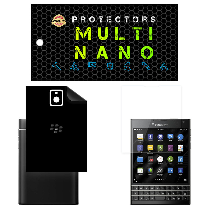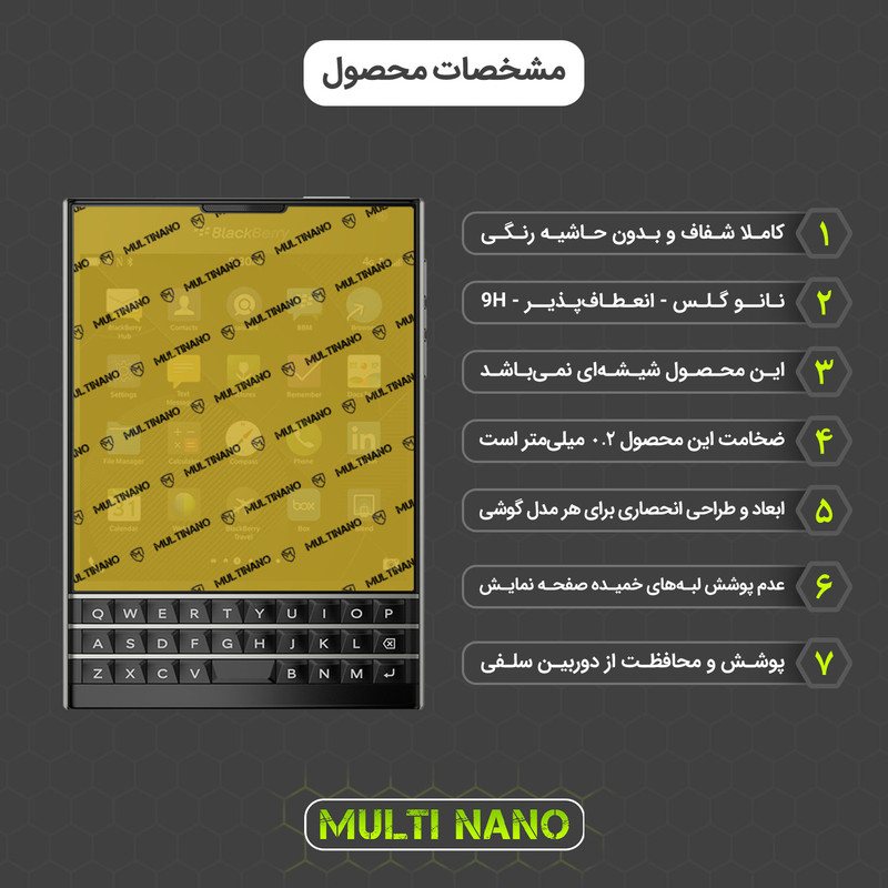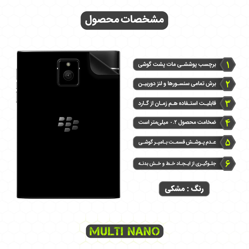 محافظ صفحه نمایش مولتی نانو MULTINANO محافظی کاملا شفاف و بدون حاشیه رنگی است که از ضخامت 0.2 میلی متری برخوردار است. این محافظ از متریال نانو ساخته شده ( شیشه ای نمیباشد) که در برابر ضربه و خط و خش از گوشی شما محافظت میکند. محافظ صفحه نمایش (گوشی موبایل BlackBerry Passport) بسیار شفاف است و به مرور زمان کدر نمیشود به همین امر کیفیت صفحه نمایش گوشی شما همیشه در حالت اولیه قرار دارد. پوشش دوربین سلفی از دیگر ویژگی های این محافظ میباشد تا دغدغه شمارا برای تمیز کردن لنز دوربین از بین ببرد.عملکرد حسگر اثرانگشت با این محافظ دچار تداخل نمیشود. نقطه قوت محافظ صفحه نمایش (گوشی موبایل بلک بری پاسپورت) این است که به صورت اختصاصی برای گوشی شما طراحی شده است و نمونه مشابه دیگری ندارد. برچسب پوششی مات مولتی نانو MULTINANO ظاهری جذاب و متفاوت به گوشی شما میدهد. این برچسب ضخامت کمی دارد تا ظرافت گوشی شما را حفظ کند و همچنین ازپشت گوشی شما در برابر خط و خش محافظت میکند. گرد و غبارهایی که بین کاور و بدنه گوشی قرار میگیرند به مرور زمان باعث ایجاد خط و خش هایی روی بدنه گوشی شما میشوند. برچسب پوششی پشت (موبایل بلک بری Passport) بهترین راه حل برای مقابله با این خط و خش هاست. این محصول به دلیل انعطاف پذیری بالا به خوبی لبه های خمیده را پوشش میدهد.