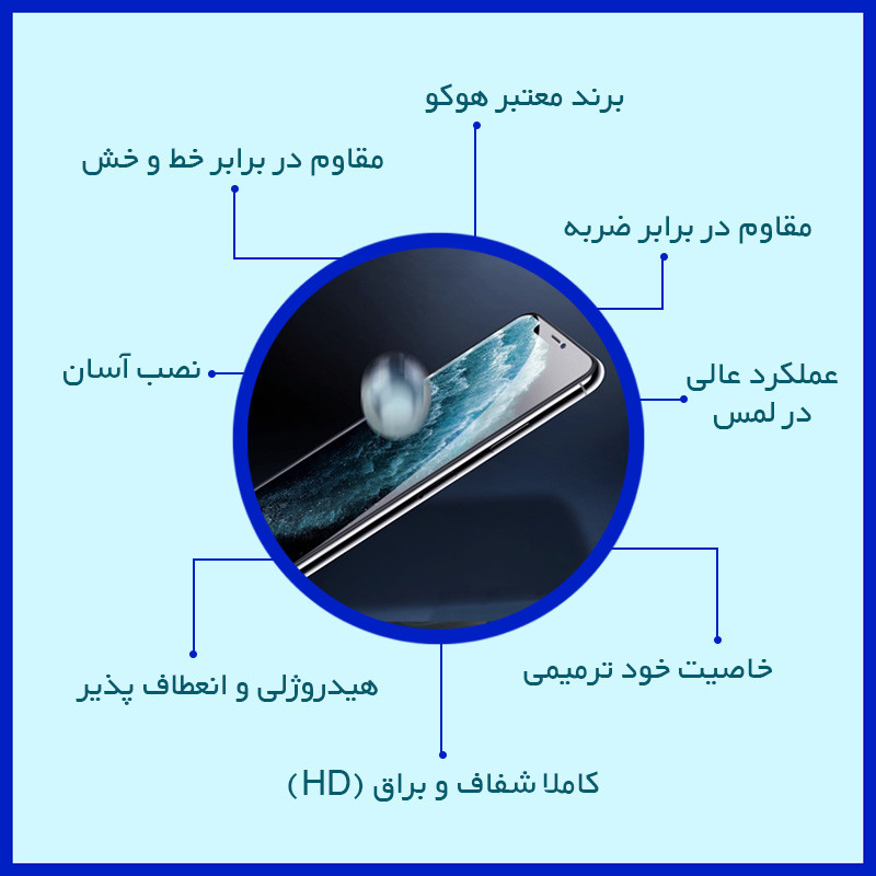 مشخصات دیگر : برند معتبر هوکو – یکدست و بدون حاشیه رنگی - خودترمیم - تشخیص سریع اثر انگشت - سرعت تاچ بالا - نصب آسان - کیفیت بالا - کاملا شفاف - قبل از نصب کلیپ آموزشی را در اینترنت مشاهده فرمایید